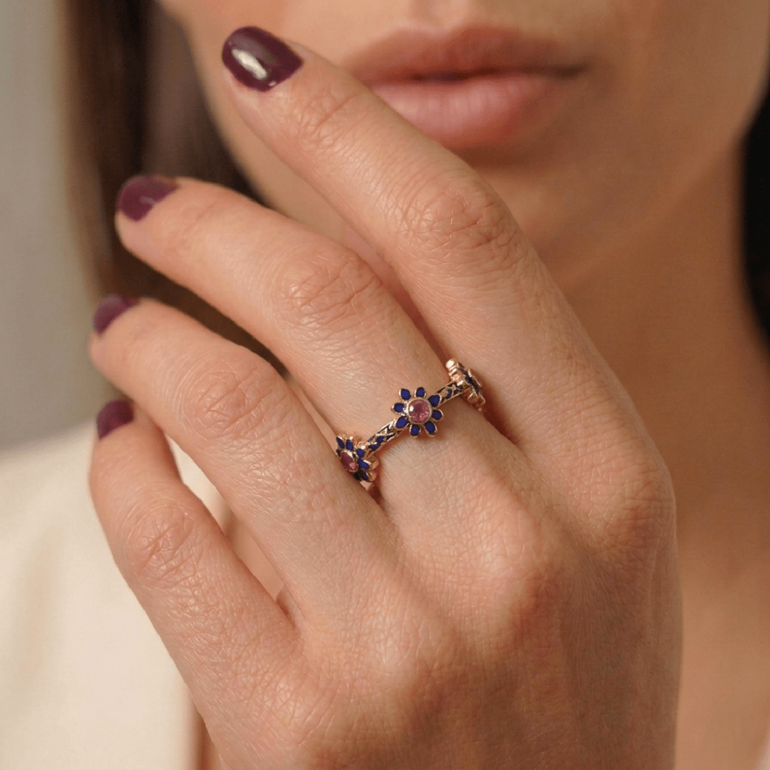 La bague 6 Fleurs Rubis en argent 925 plaqué or 22 carats, émaillée de bleu, offre un design délicat où chaque fleur encadre une magnifique pierre rubis rose. Un bijou unique, où l’intensité de l’émail bleu et la beauté des rubis se rencontrent pour créer une alliance élégante et intemporelle. Une pièce raffinée qui allie artisanat et sophistication.