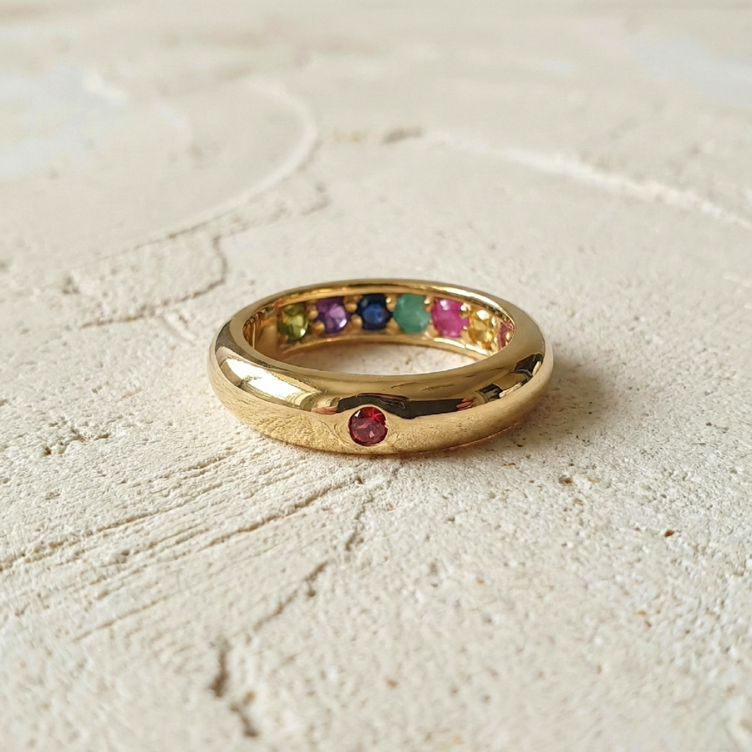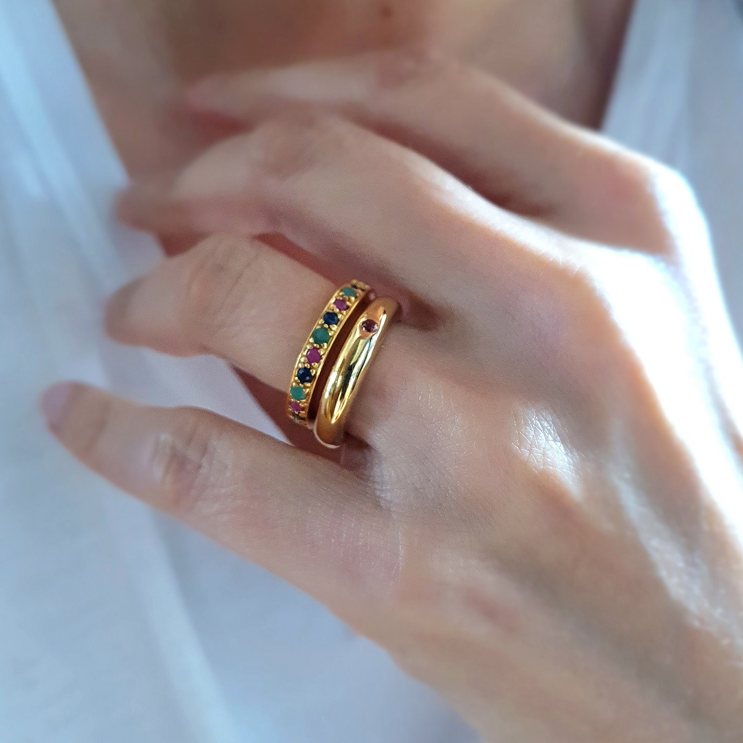 Raffinée, discrète et profondément symbolique, cette alliance précieuse mêle élégance intemporelle et énergie bienveillante. Chaque pierre est naturelle, les couleurs peuvent légèrement varier.