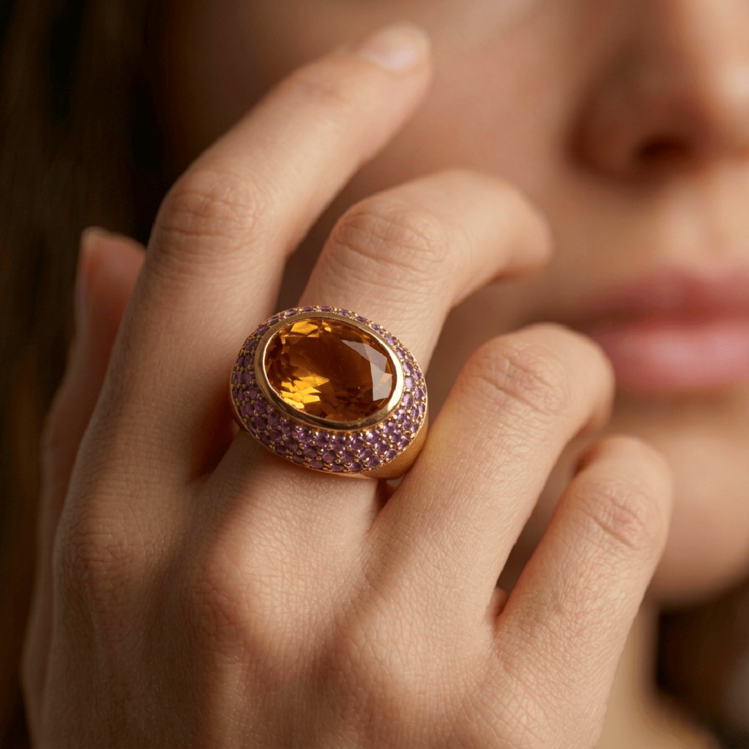 Bague en argent 925 recouverte d’or 22 carats, ornée d’une magnifique citrine ovale. Cette pièce est délicatement embellie par un pavé d’améthystes qui apportent une touche de couleur et de raffinement. Chaque pierre, unique par sa forme et ses nuances, témoigne du savoir-faire artisanal et de la passion pour les matériaux nobles.