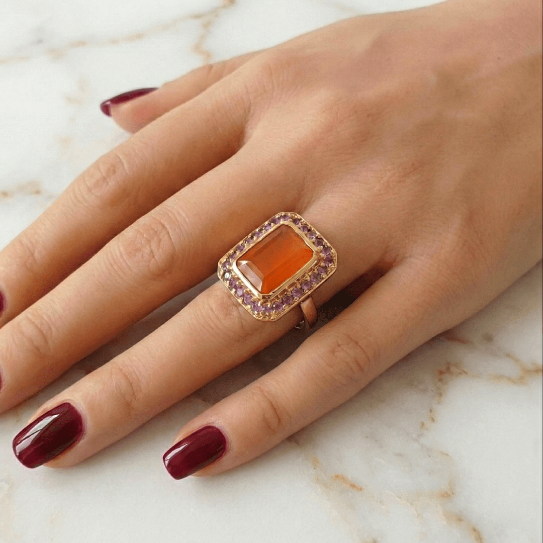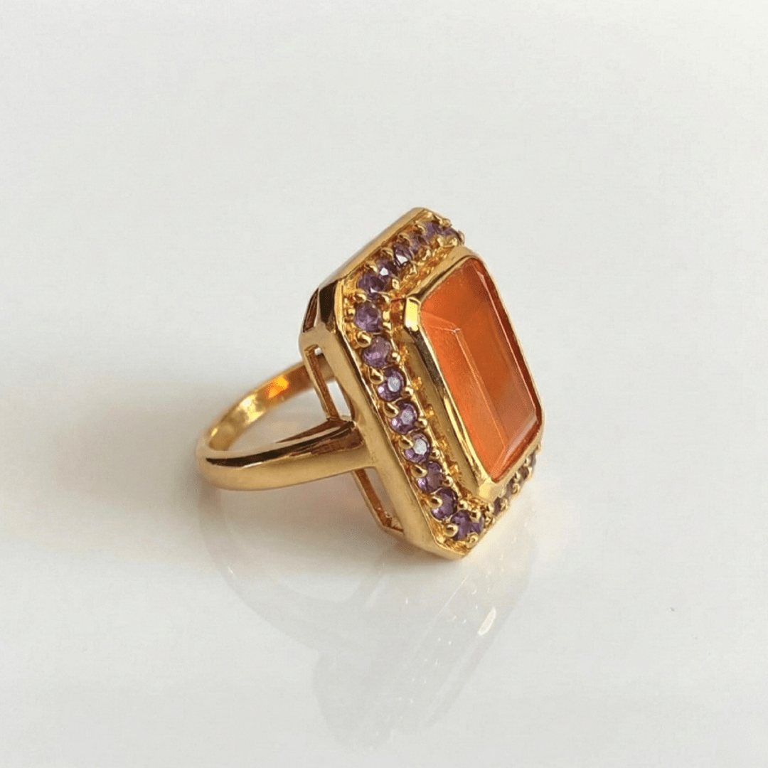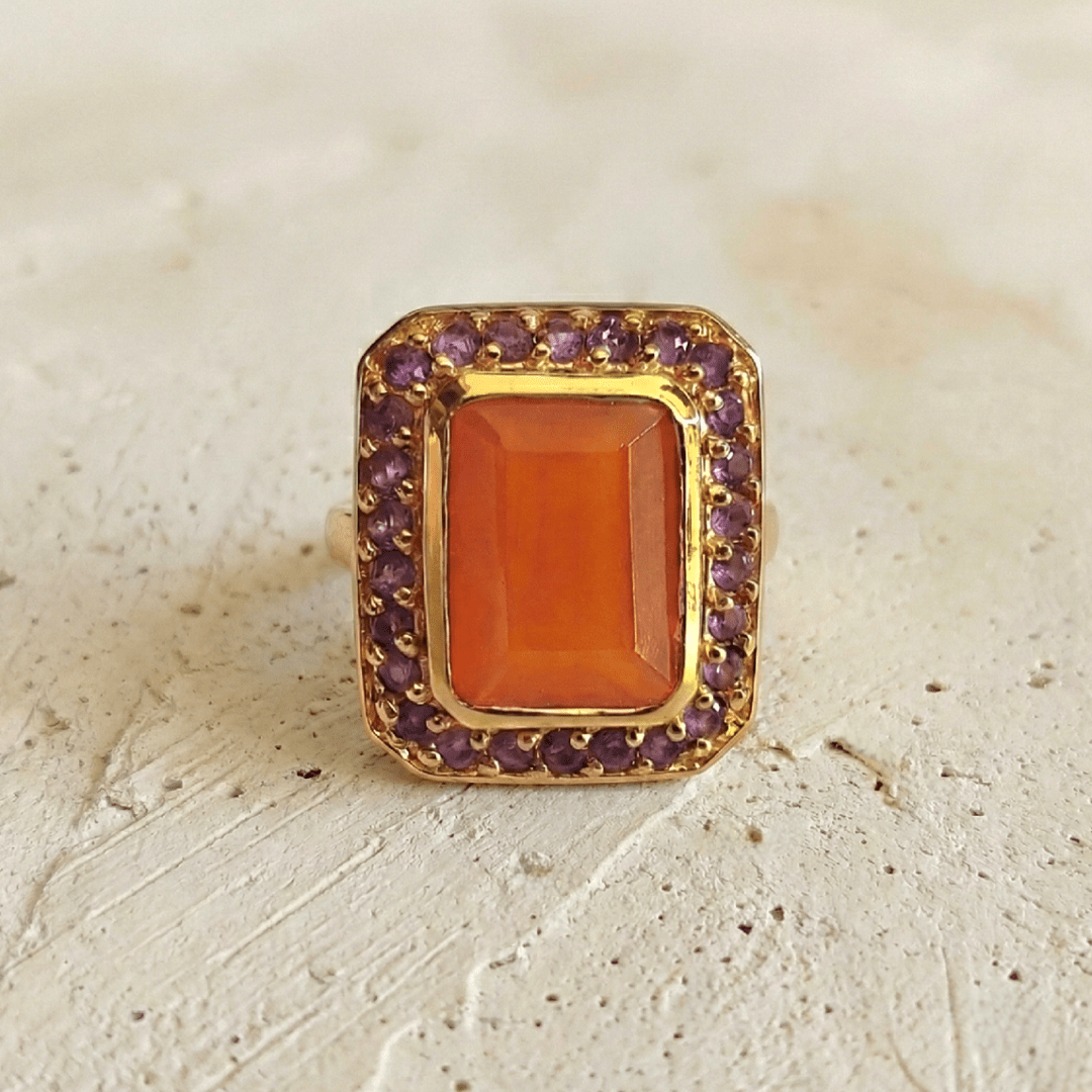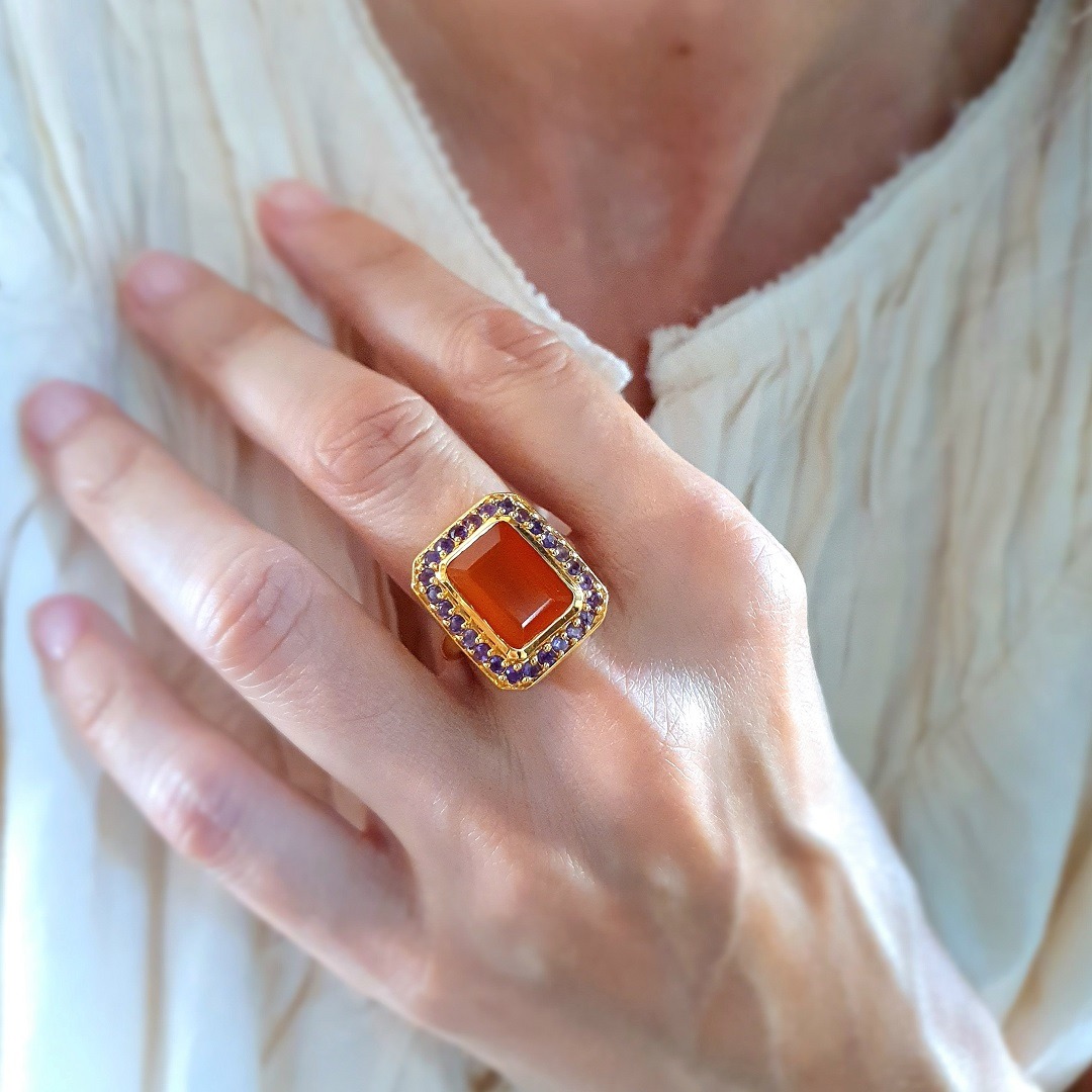 Bague en argent 925 recouverte d’or 22 carats, ornée d’une cornaline rectangle aux teintes chaudes, et sublimée par des améthystes éclatantes. L’harmonie parfaite entre la cornaline aux couleurs chaleureuses et les nuances profondes des améthystes crée un contraste fascinant, apportant à cette pièce une grande sophistication et un caractère unique.
