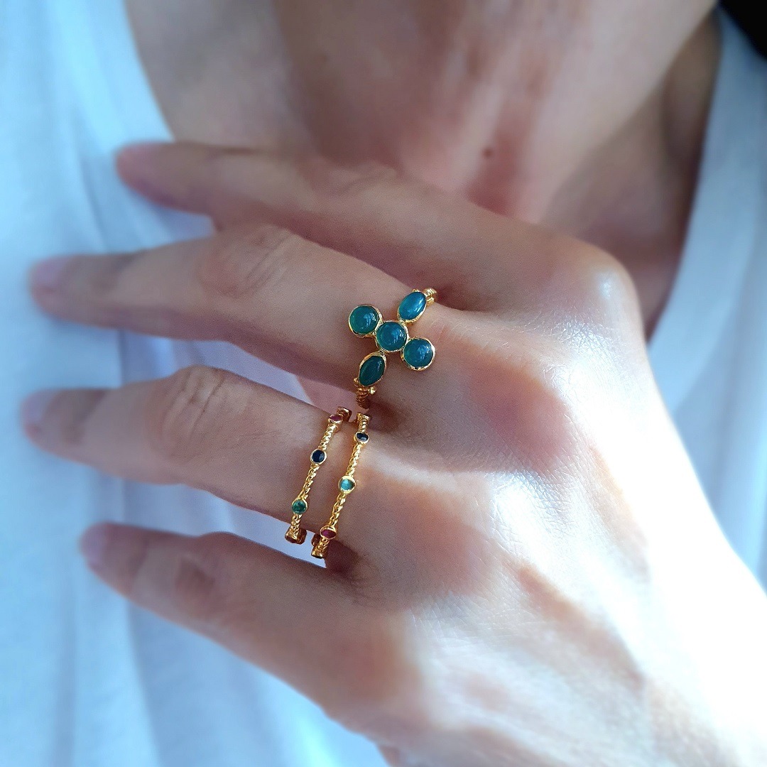 Bague croix en argent 925 plaqué or 22 carats sertie d’émeraudes.