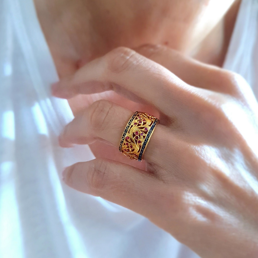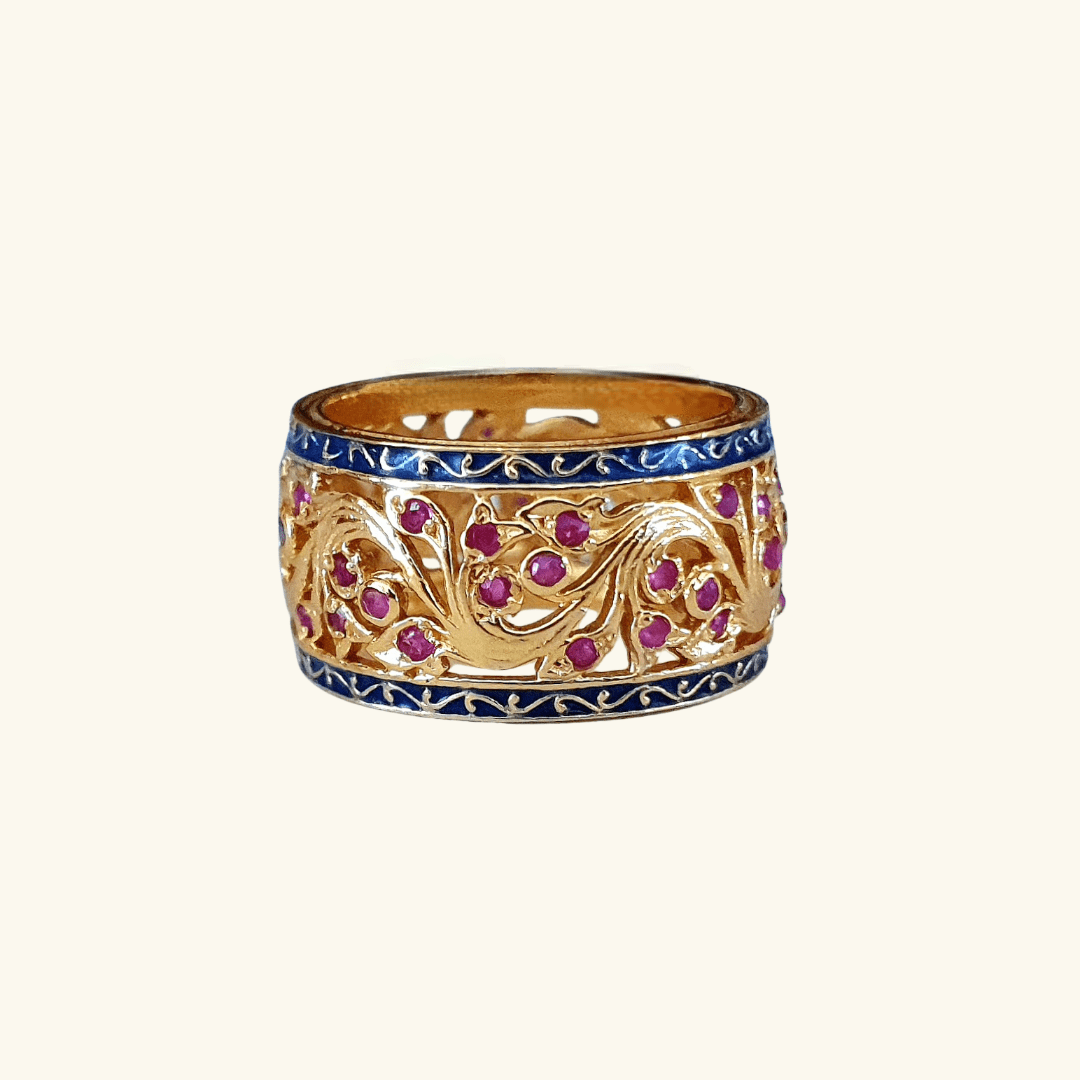 La bague Dentelle Rubis est une véritable pièce d’exception, inspirée de l’art joaillier antique. Réalisée en argent 925 sublimée par un plaquage en or 22 carats, cette pièce dévoile un délicat travail de dentelle dorée finement ciselée. Les rubis étincelants, sertis avec soin, s’entrelacent dans une arabesque dorée, encadrée de bordures en émail bleu profond.