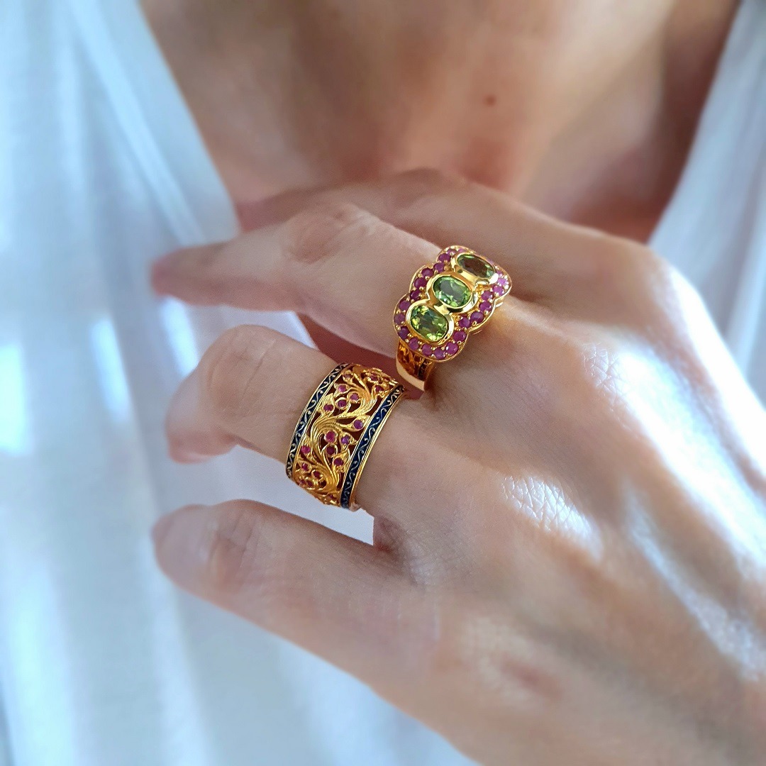 Chaque détail célèbre le savoir-faire artisanal et la richesse des traditions. Véritable déclaration de style, cette bague se porte comme une œuvre d’art. Chaque pierre étant unique, les couleurs peuvent légèrement varier, rendant votre bijou encore plus singulier.