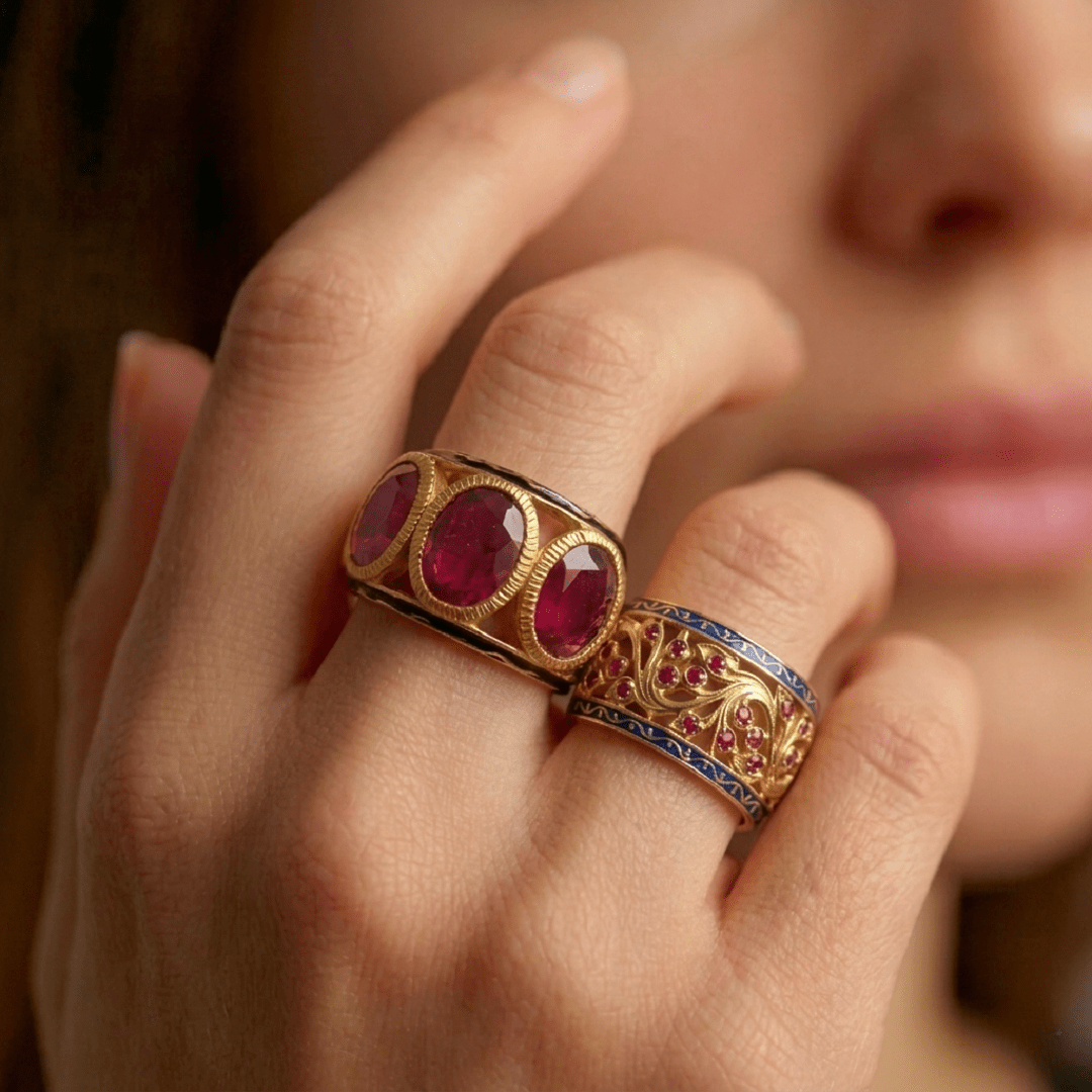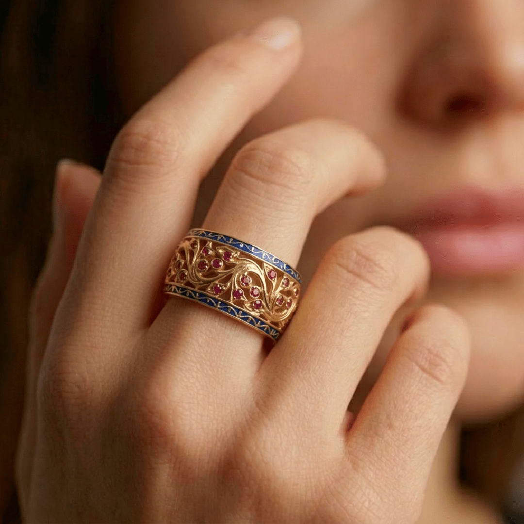 La bague Dentelle Rubis est une véritable pièce d’exception, inspirée de l’art joaillier antique. Réalisée en argent 925 sublimée par un plaquage en or 22 carats, cette pièce dévoile un délicat travail de dentelle dorée finement ciselée. Les rubis étincelants, sertis avec soin, s’entrelacent dans une arabesque dorée, encadrée de bordures en émail bleu profond.