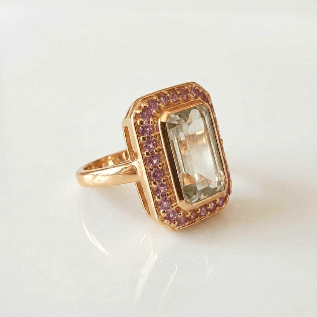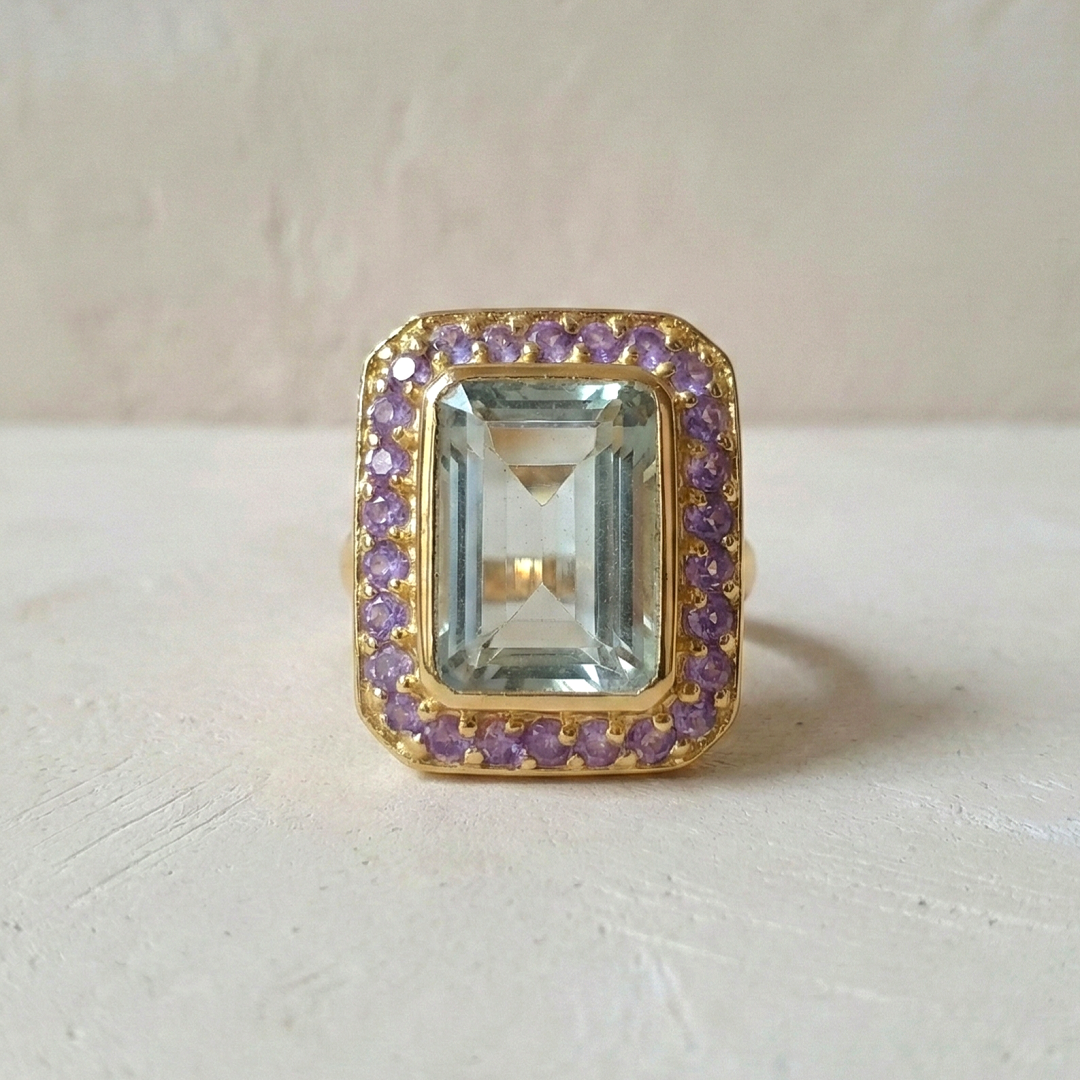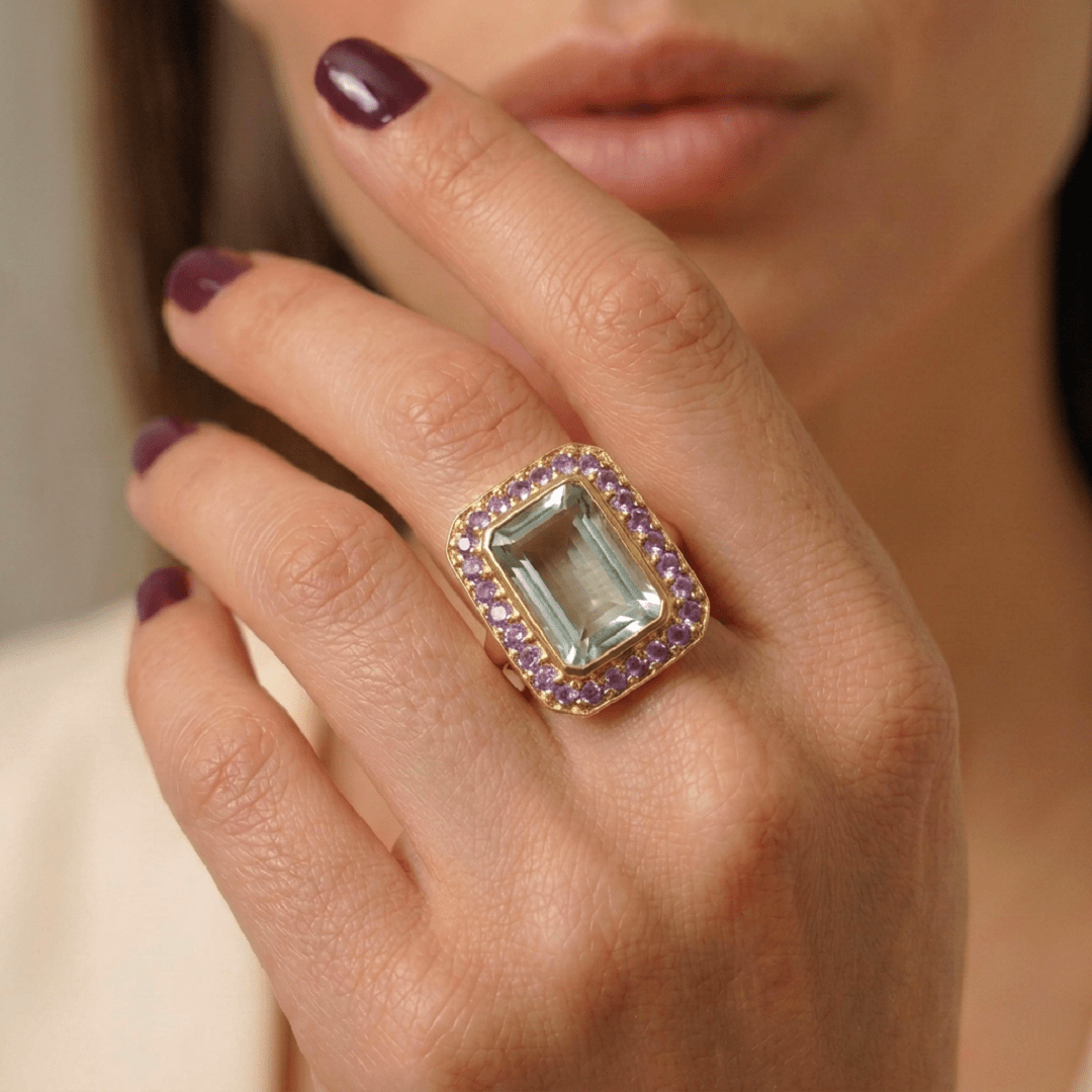 Eclat et équilibre s’unissent dans la bague Duo sertie d’une améthyste verte rectangulaire entourée de petites améthystes violettes.
