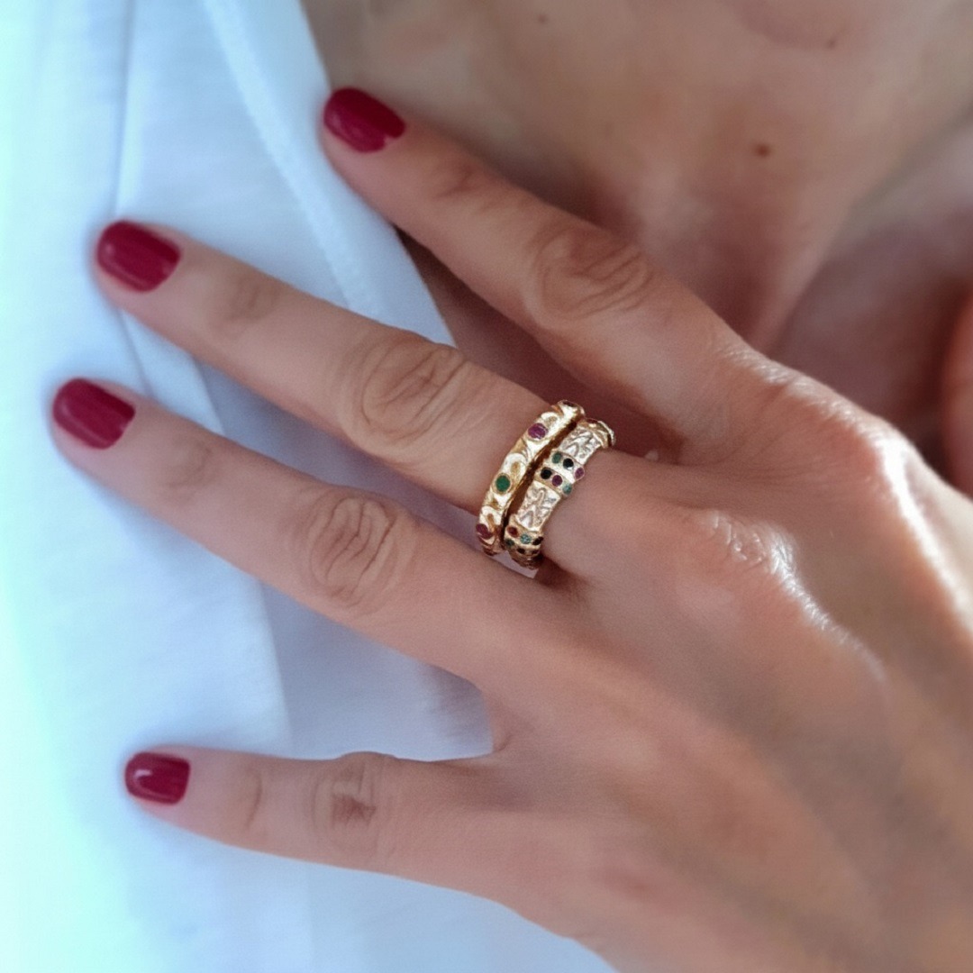 Bague Esmée en argent 925 plaqué or 22 carats émaillée ivoire sertie d’émeraudes, de rubis et de saphirs.
