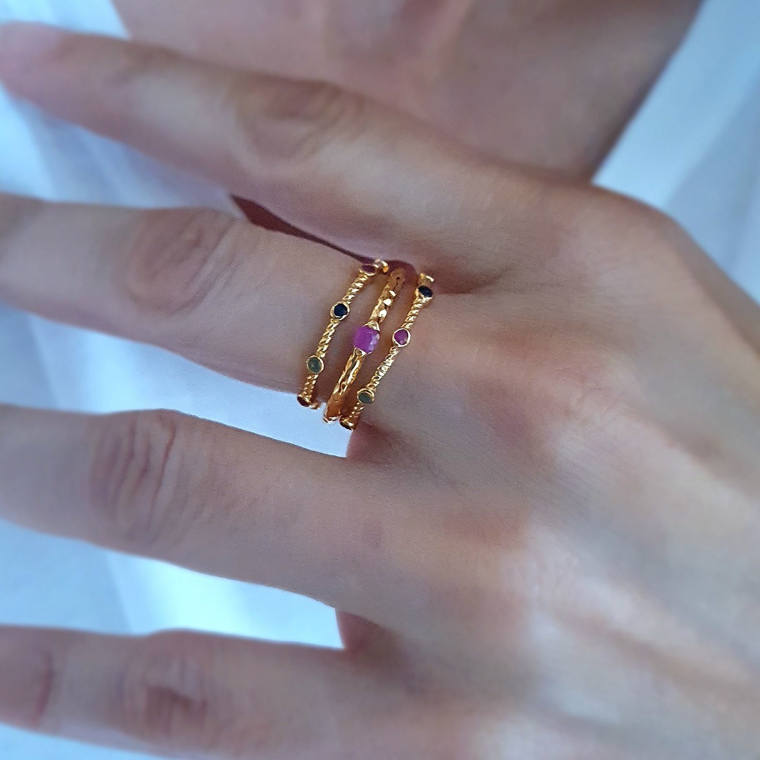 Bague fine martelée en argent 925 recouverte d’or 22 carats, sertie d’un magnifique rubis rose. Parfaite pour être portée seule ou en accumulation, cette bague est idéale pour celles qui recherchent un accessoire raffiné au design élégant et intemporel.