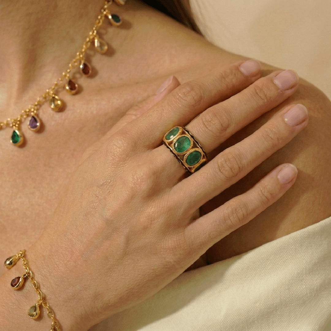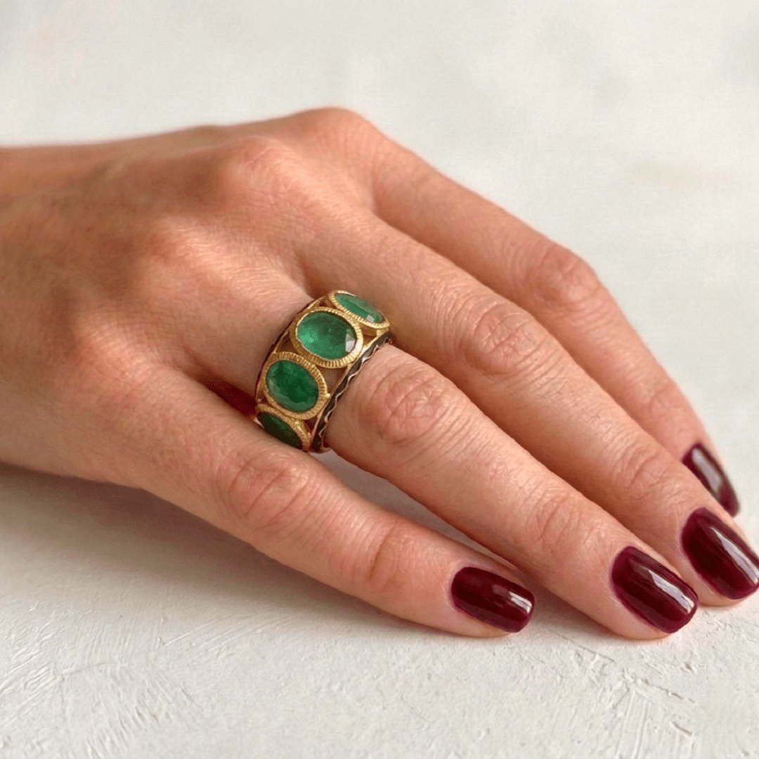 Son design raffiné mêle l’élégance intemporelle des émeraudes à la richesse des ornements artisanaux. Parfaite pour les amateurs de bijoux uniques et sophistiqués.