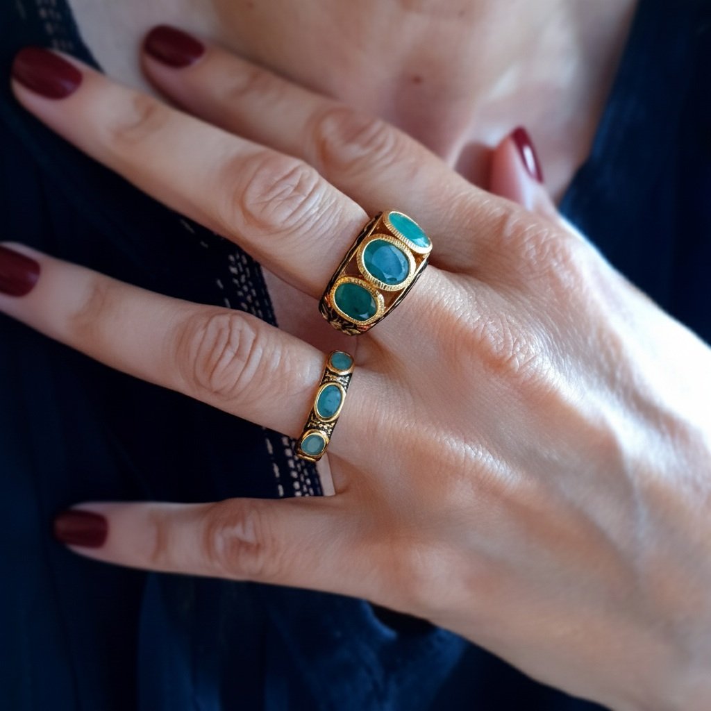 Bague Hera en argent 925 plaqué or 22 carats ornée de magnifiques émeraudes facettées, sublimée par son émail noir et ses délicats motifs floraux. Son design raffiné mêle l’élégance intemporelle des émeraudes à la richesse des ornements artisanaux. Parfaite pour les amateurs de bijoux uniques et sophistiqués.