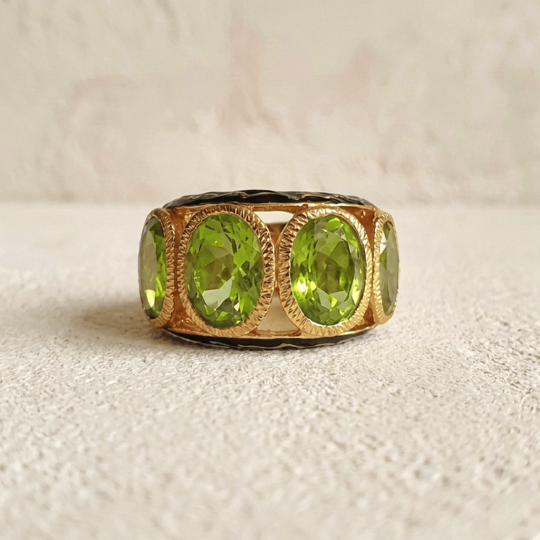 La bague Hera Péridot illumine la main par l’éclat vibrant de ses pierres naturelles aux nuances vertes lumineuses. Quatre péridots ovales se dévoilent dans une composition harmonieuse qui capte délicatement la lumière. Leur éclat contraste subtilement avec la chaleur de la monture en argent 925 plaqué or 22 carats. Les côtés de la bague sont sublimés par un travail d’émail délicat et de motifs floraux finement travaillés. Ces détails soulignent le savoir-faire artisanal et mettent en valeur la richesse des matériaux.