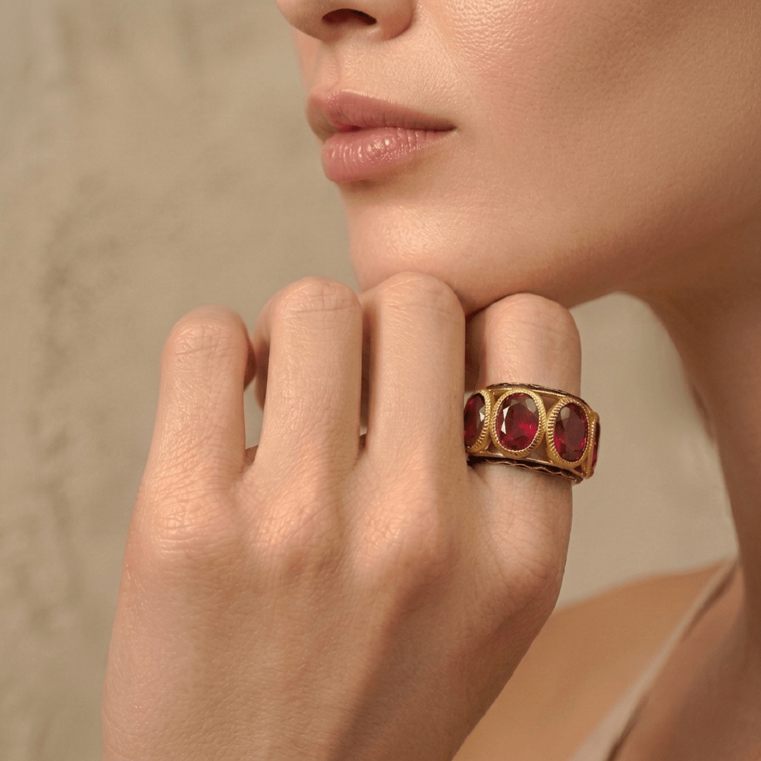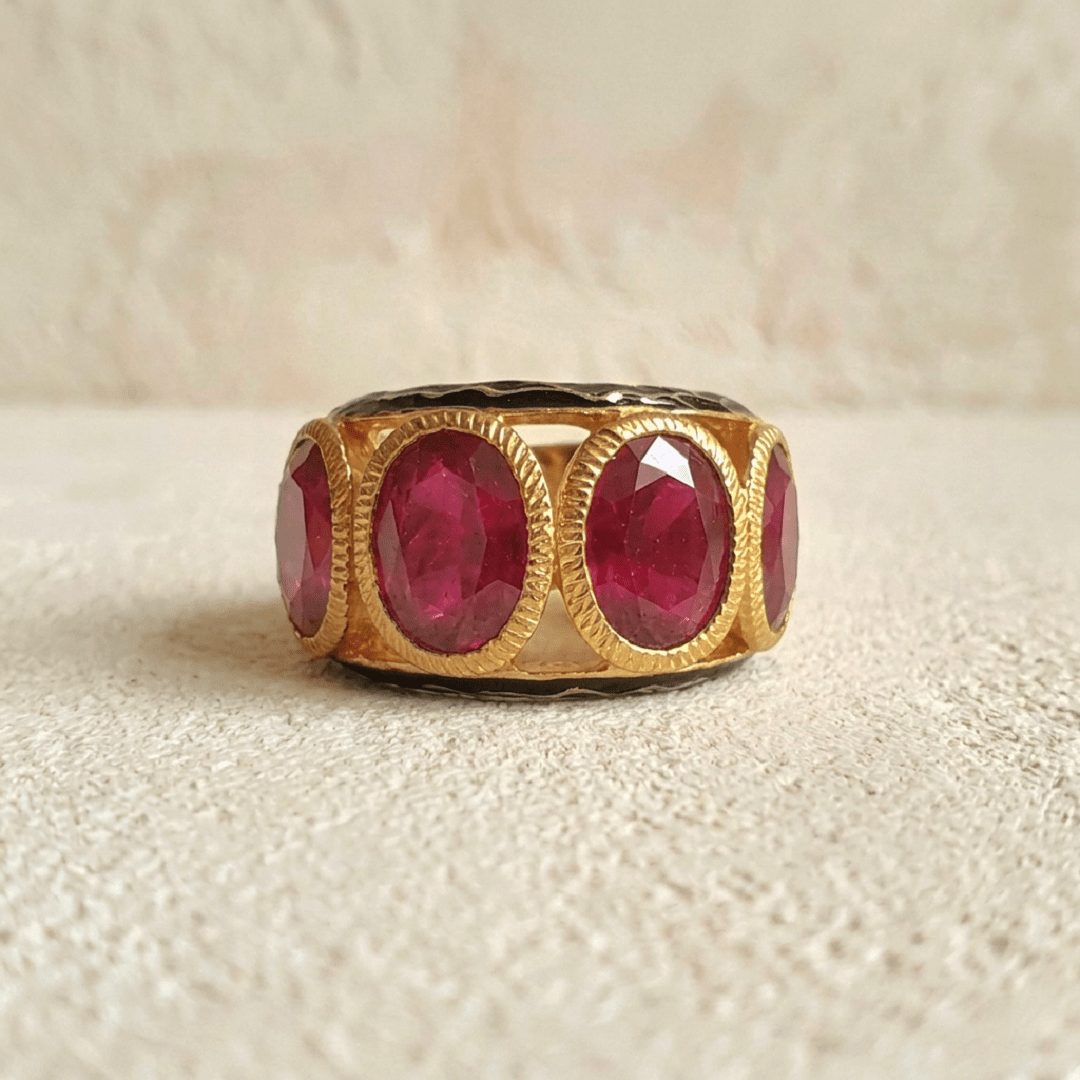 La bague Hera Rubis est un bijou artisanal précieux qui révèle toute l’intensité des pierres naturelles. Ornée de quatre rubis ovales, cette bague dévoile un rouge profond et lumineux qui capte la lumière avec élégance. Les pierres sont délicatement serties dans une monture en argent 925 recouvert d’un plaquage en or 22 carats. Les détails émaillés et le travail du métal rappellent le savoir-faire des bijoux anciens et soulignent la dimension artisanale de cette création. Chaque finition met en valeur la beauté des gemmes et l’harmonie des formes.