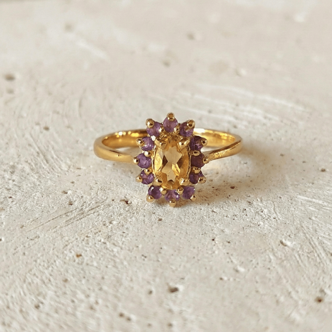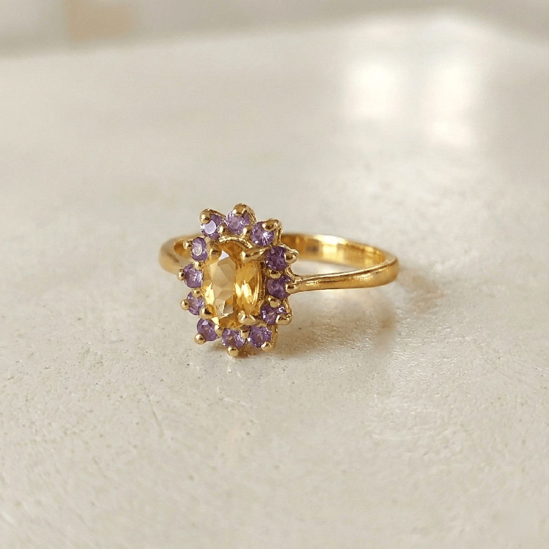 Laissez-vous charmer par l’éclat solaire de la bague Marguerite, une création raffinée en argent 925 plaqué or 22 carats. En son cœur, une citrine lumineuse rayonne d’une chaleur dorée, capturant la lumière avec éclat. Autour d’elle, de délicates améthystes, soigneusement serties, forment une marguerite aux reflets violets, à la fois douce et envoûtante.