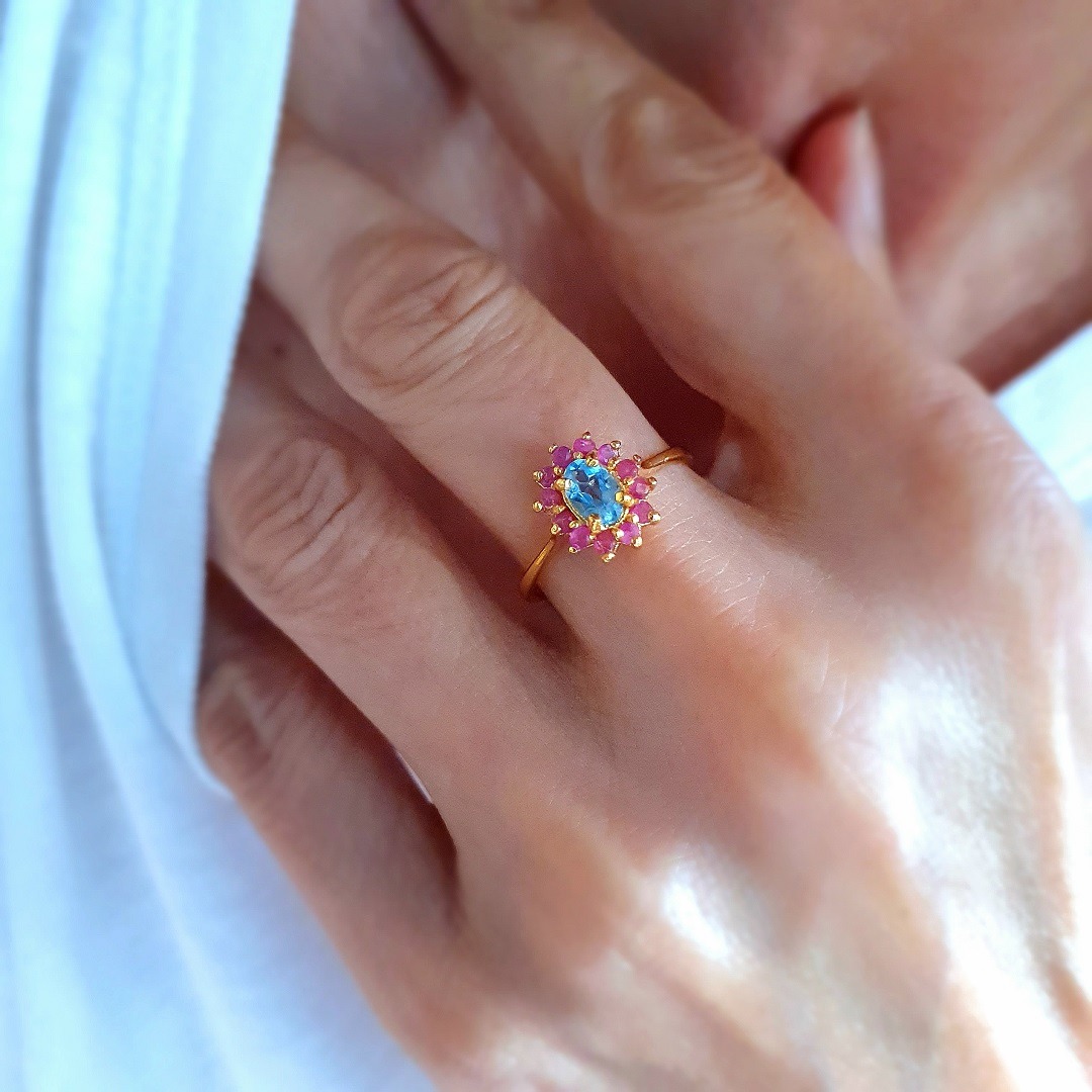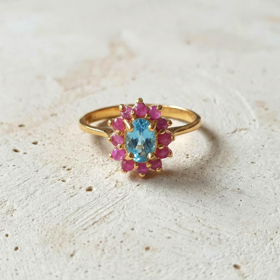 Laissez-vous séduire par l’élégance florale de la bague Marguerite, une création délicate en argent 925 plaqué or 22 carats. En son centre, une topaze bleue capte la lumière avec douceur, tandis que des rubis roses, minutieusement sertis, dessinent une marguerite précieuse et féminine.
