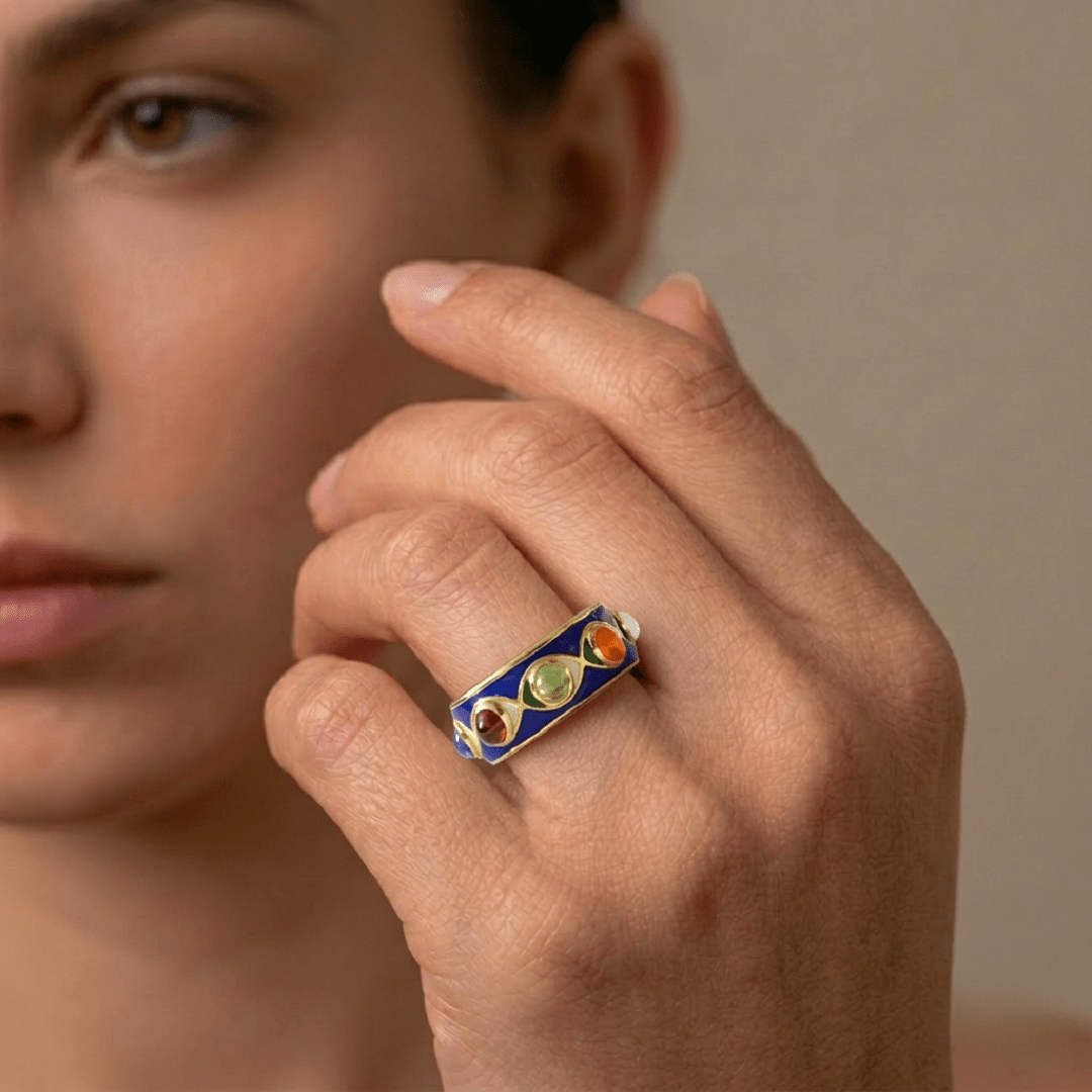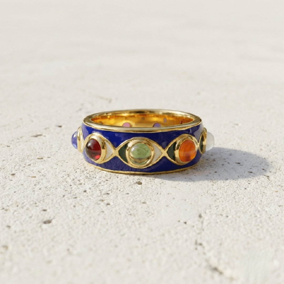 Laissez-vous séduire par la bague Oeil émail bleu, un bijou talisman en argent 925 plaqué or 22 carats, orné de pierres fines et précieuses. L’intensité du bleu profond contraste harmonieusement avec la chaleur de l’or, créant une pièce à la fois mystique et élégante.