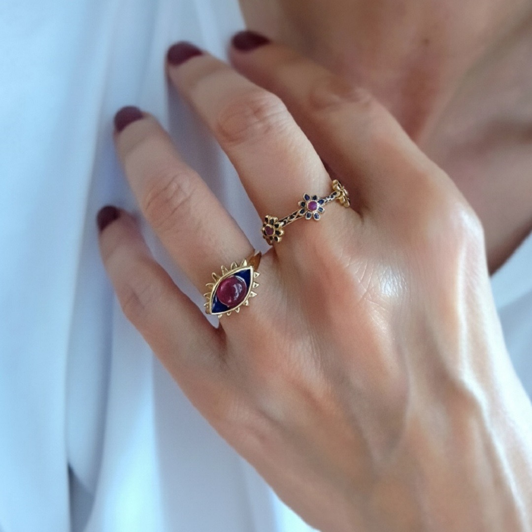 Élégante et mystérieuse, la bague œil rubis en argent 925 plaqué or 22 carats marie avec finesse puissance symbolique et sophistication moderne. Au centre, un rubis éclatant se pare d’un délicat contour en émail bleu profond, qui sublime et intensifie le regard protecteur de l’œil.