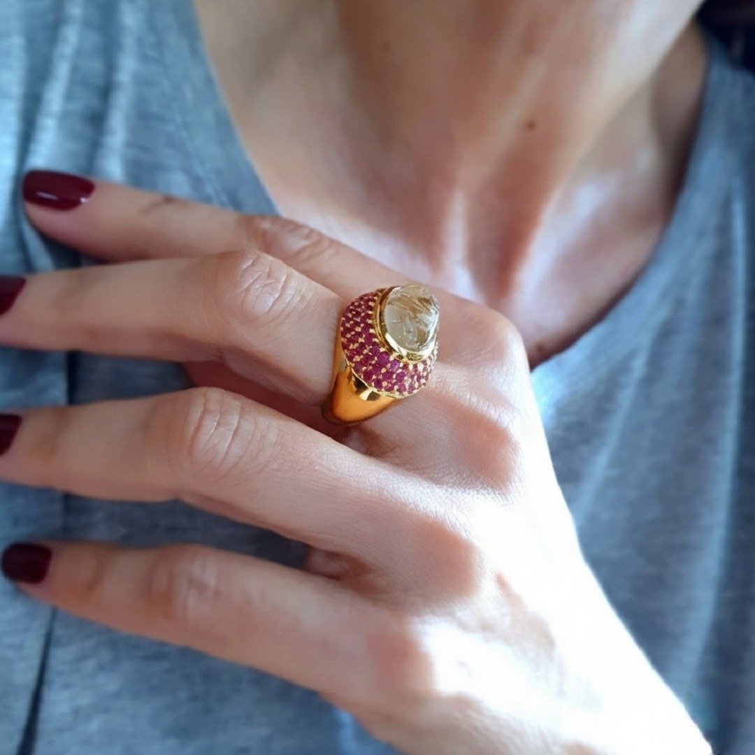 Bague en argent 925, délicatement recouverte d’or 22 carats, sublimée par un quartz rutile et des rubis soigneusement sélectionnés. Chaque pierre est unique et dévoile une beauté rare. Le quartz rutile, aux nuances dorées subtiles, s’harmonise magnifiquement avec l’éclat profond des rubis, créant une alliance parfaite de raffinement et de sophistication.