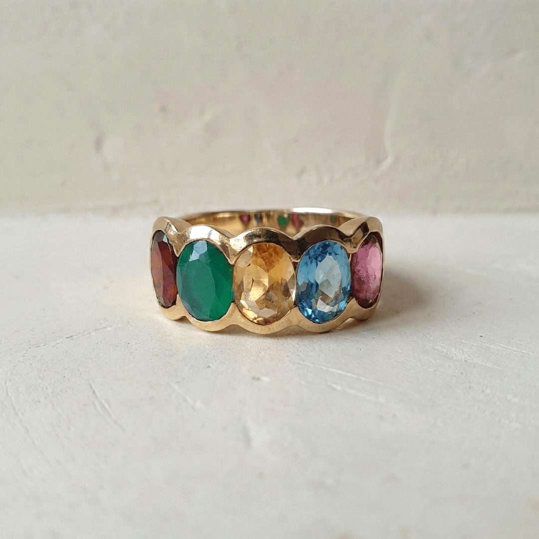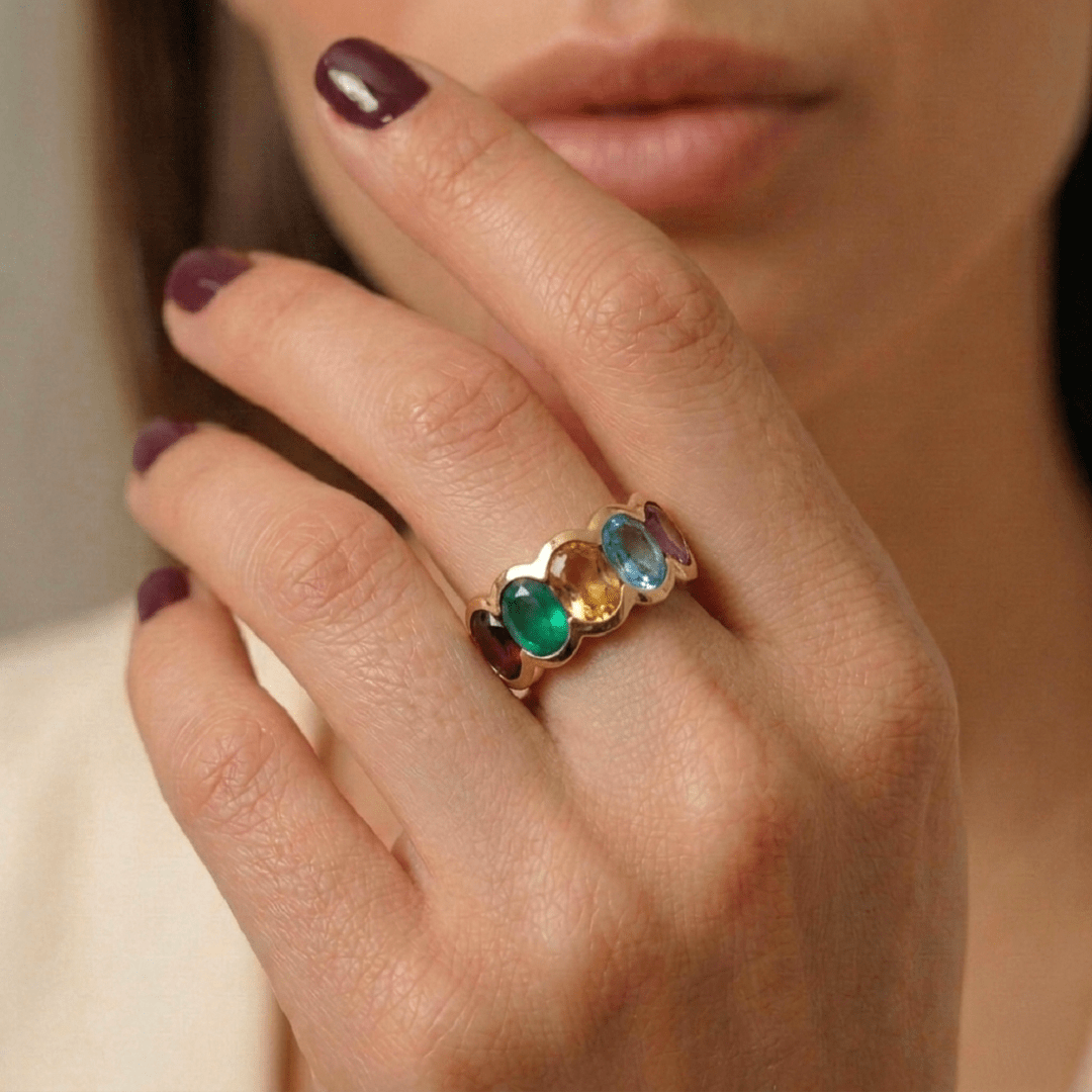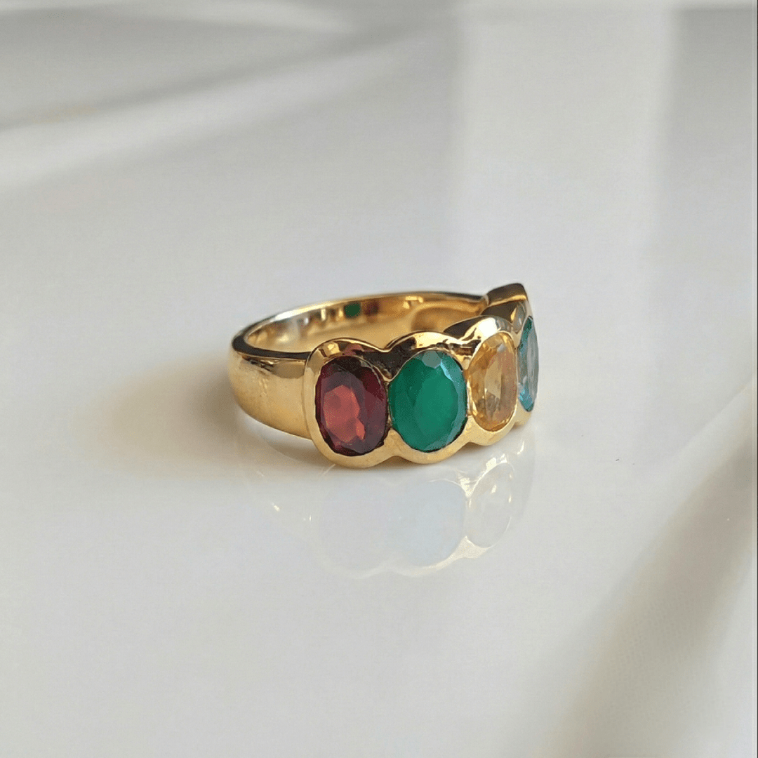 Ajoutez une touche de lumière et de couleur à votre style avec la bague Rainbow. Cette création unique en argent 925 recouvert d’or 22 carats met en valeur cinq magnifiques pierres fines aux teintes vibrantes. Chaque pierre incarne une énergie particulière, faisant de cette bague un symbole d’harmonie, de beauté et de force intérieure. Son design audacieux mais intemporel en fait un bijou à la fois moderne et inspirant.