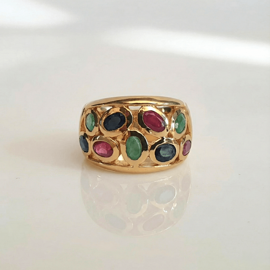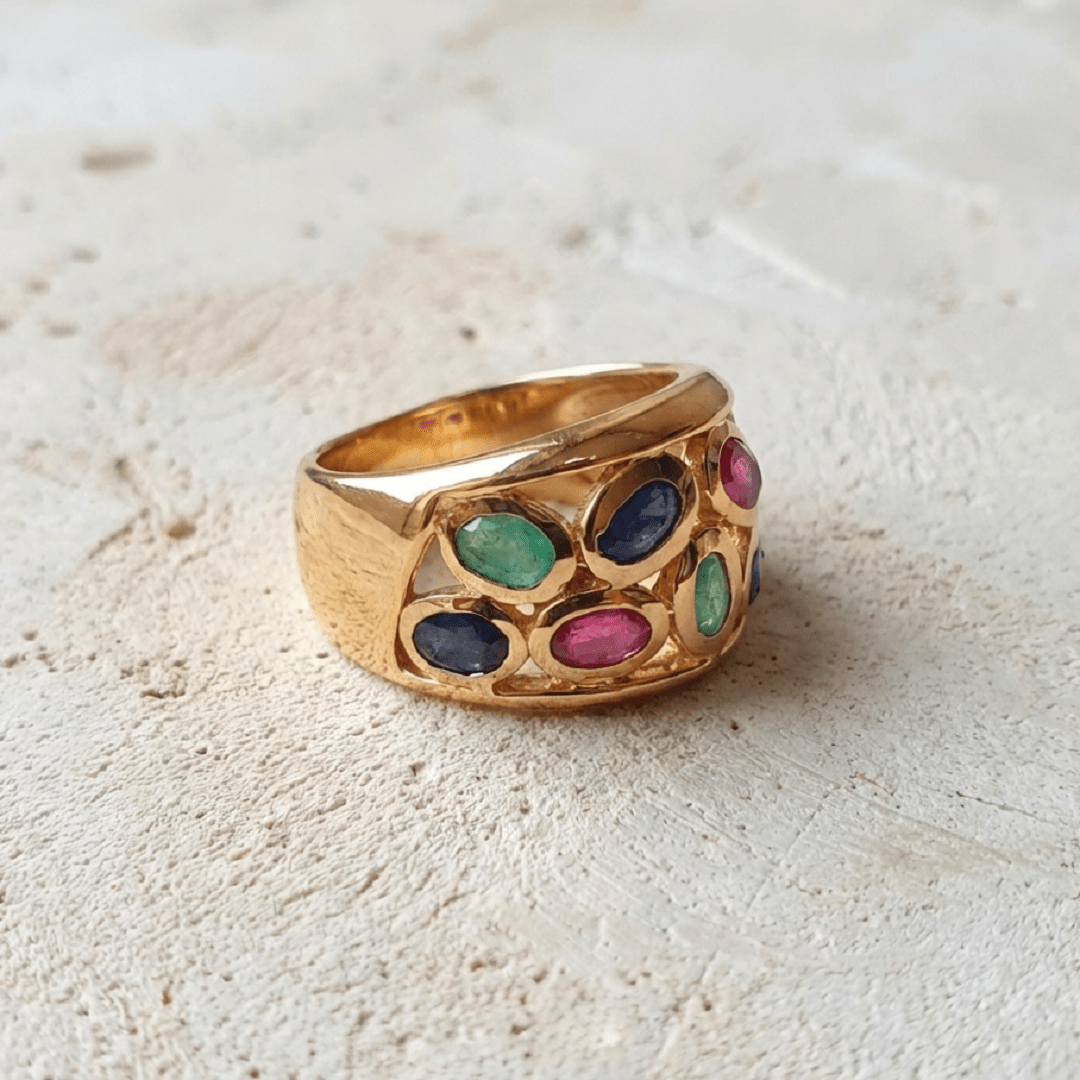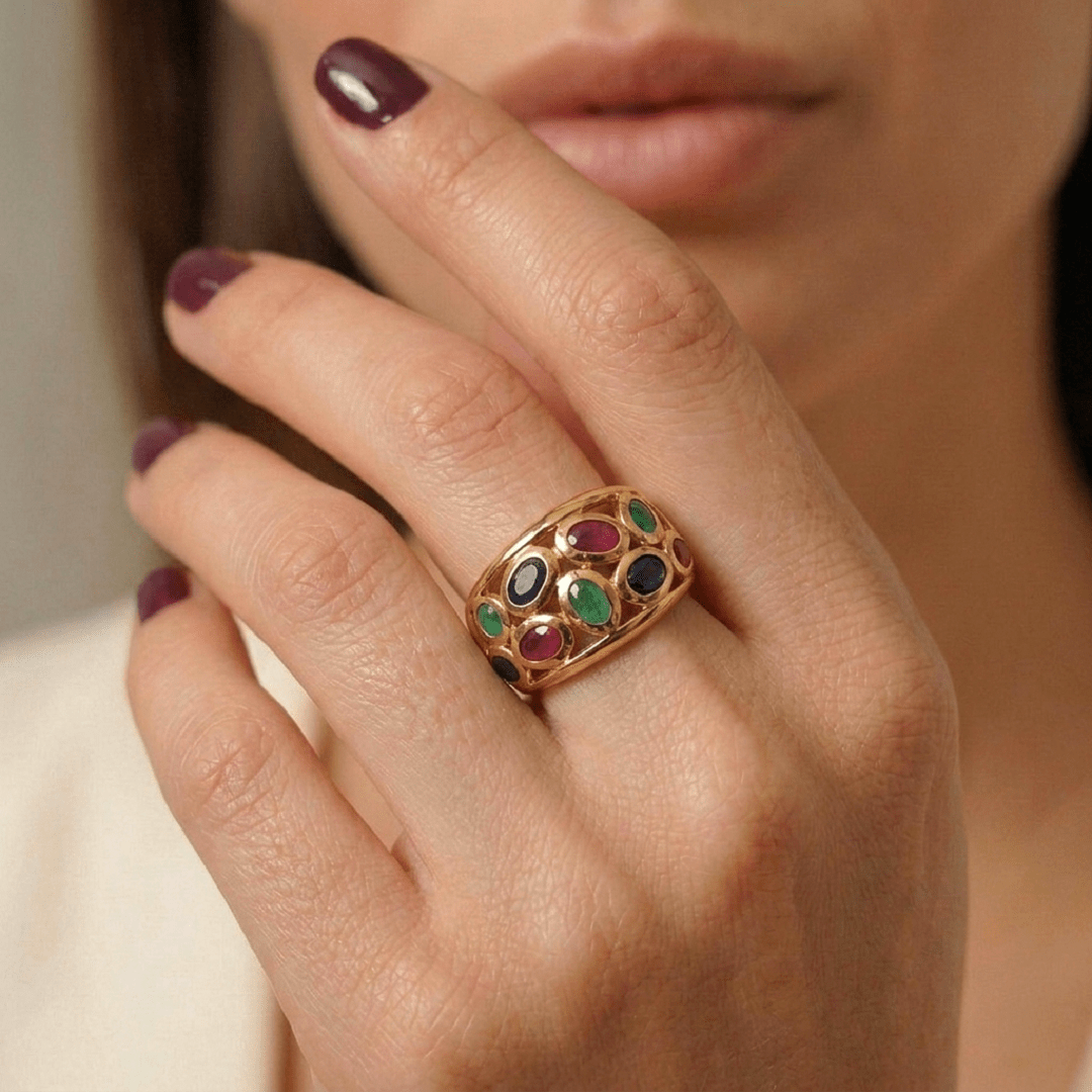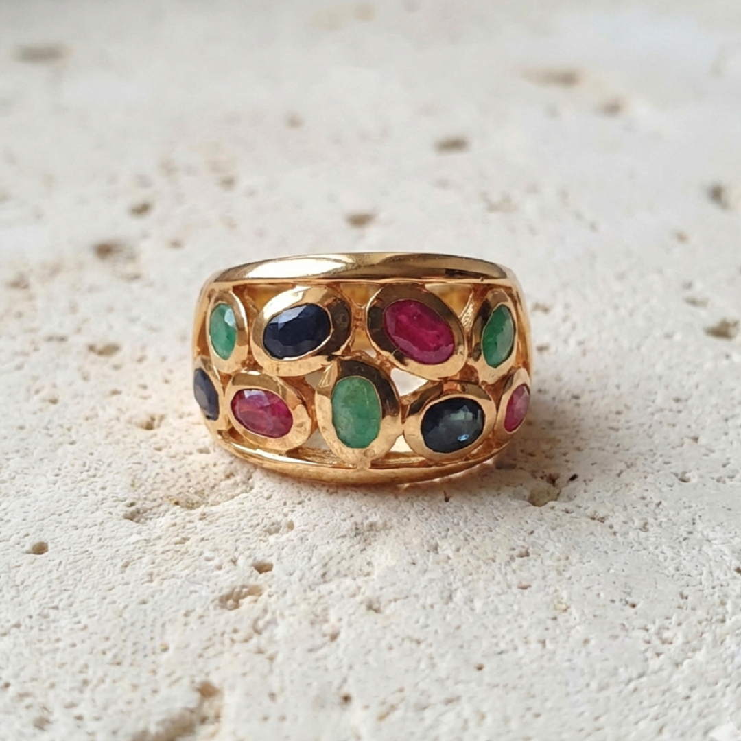 Plongez dans un univers de raffinement avec la bague Riviera, une création élégante et audacieuse en argent 925 sublimée par un plaquage en or 22 carats. Cette bague aux lignes généreuses met en valeur une mosaïque de pierres précieuses. Chaque pierre est soigneusement sertie dans un jeu de couleurs profondes et lumineuses, offrant un contraste sophistiqué.