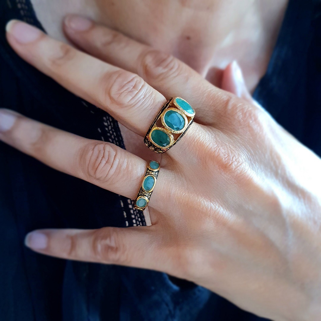 La bague Romy est conçue en argent 925 plaqué or 22 carats et ornée de superbes émeraudes facettées. Chaque émeraude est minutieusement sélectionnée pour sa couleur et sa pureté, offrant ainsi une pièce authentique et pleine de caractère. Son design moderne et raffiné se distingue par un émaillage noir subtil, créant un contraste élégant avec la brillance des émeraudes.