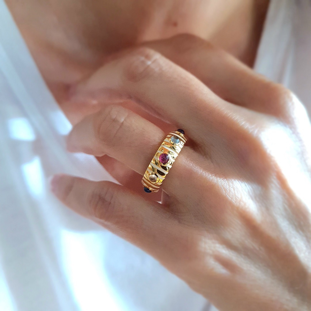 Bague striée émail blanc en argent 925 plaqué or 22 carats sertie de pierres fines et précieuses.