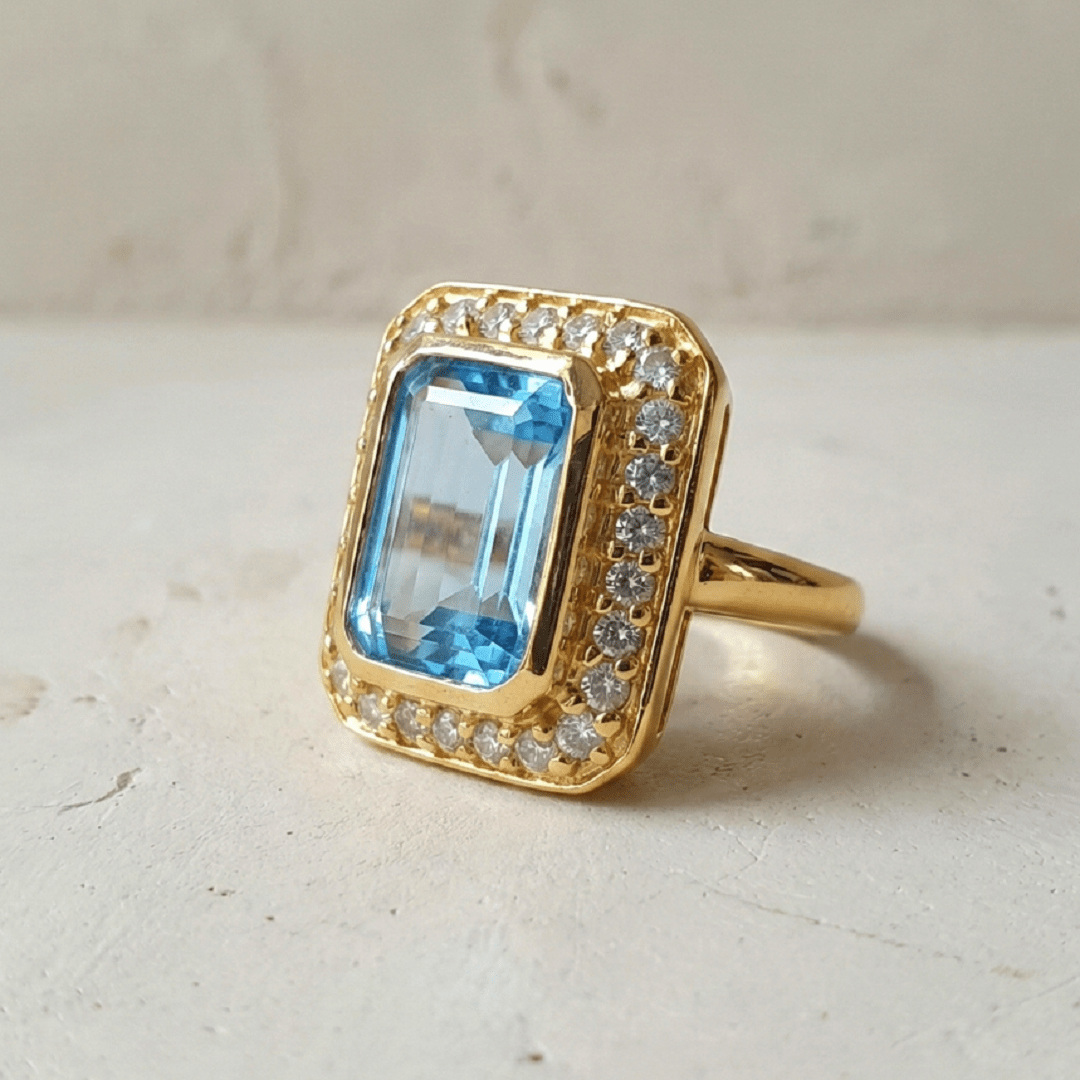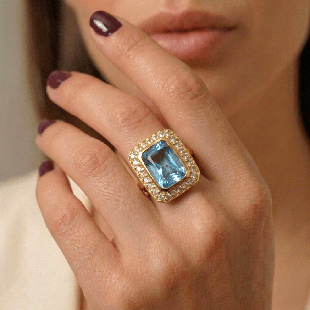 Laissez-vous séduire par l’éclat captivant de cette bague sertie d’une somptueuse topaze bleue rectangulaire, entourée de petites topazes bleues scintillantes. Réalisée en argent 925 et recouverte d’or 22 carats, cette pièce raffinée allie éclat, noblesse des matériaux et finesse artisanale.