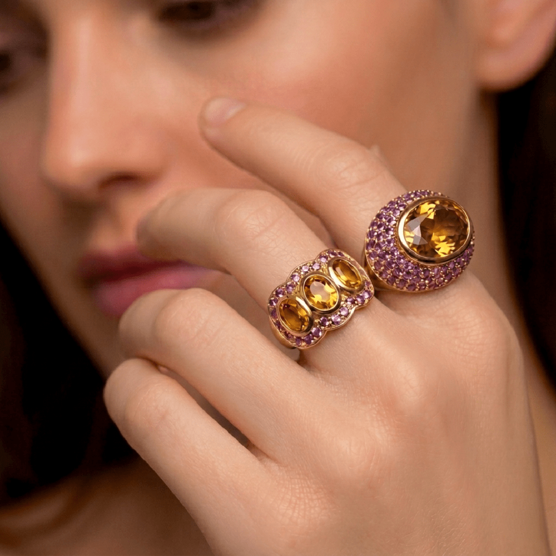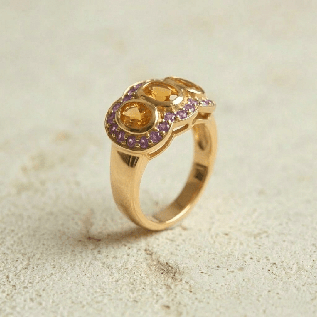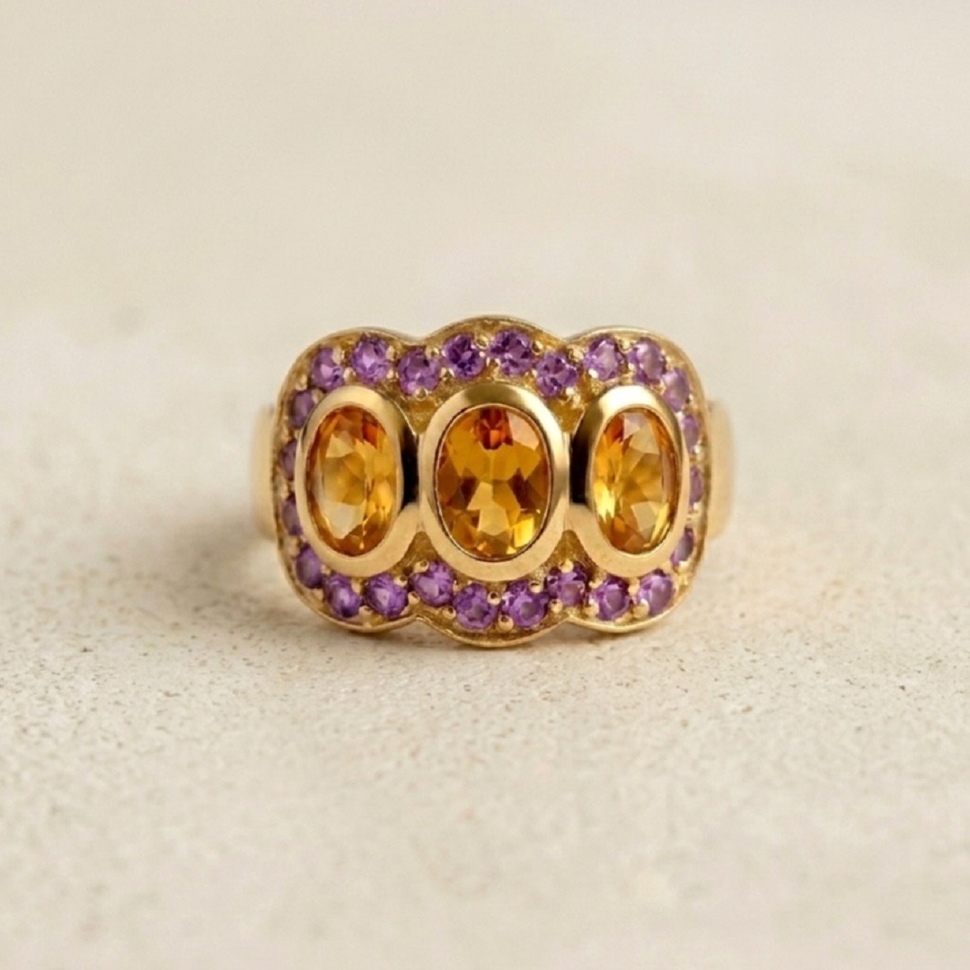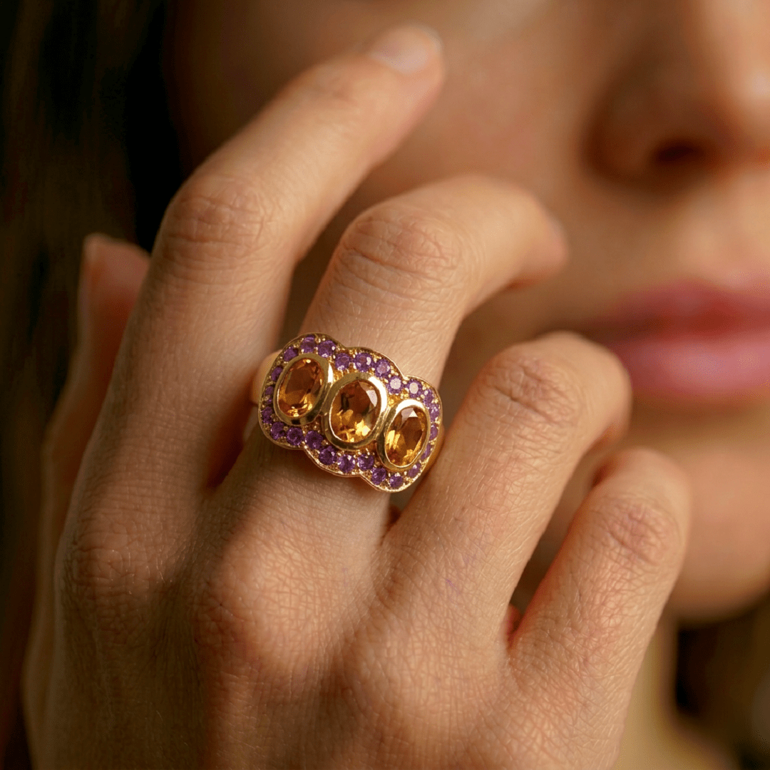 Bague en argent 925 recouverte d’or 22 carats ornée de trois citrines éclatantes, sublimées par un délicat pavé d’améthystes scintillantes.