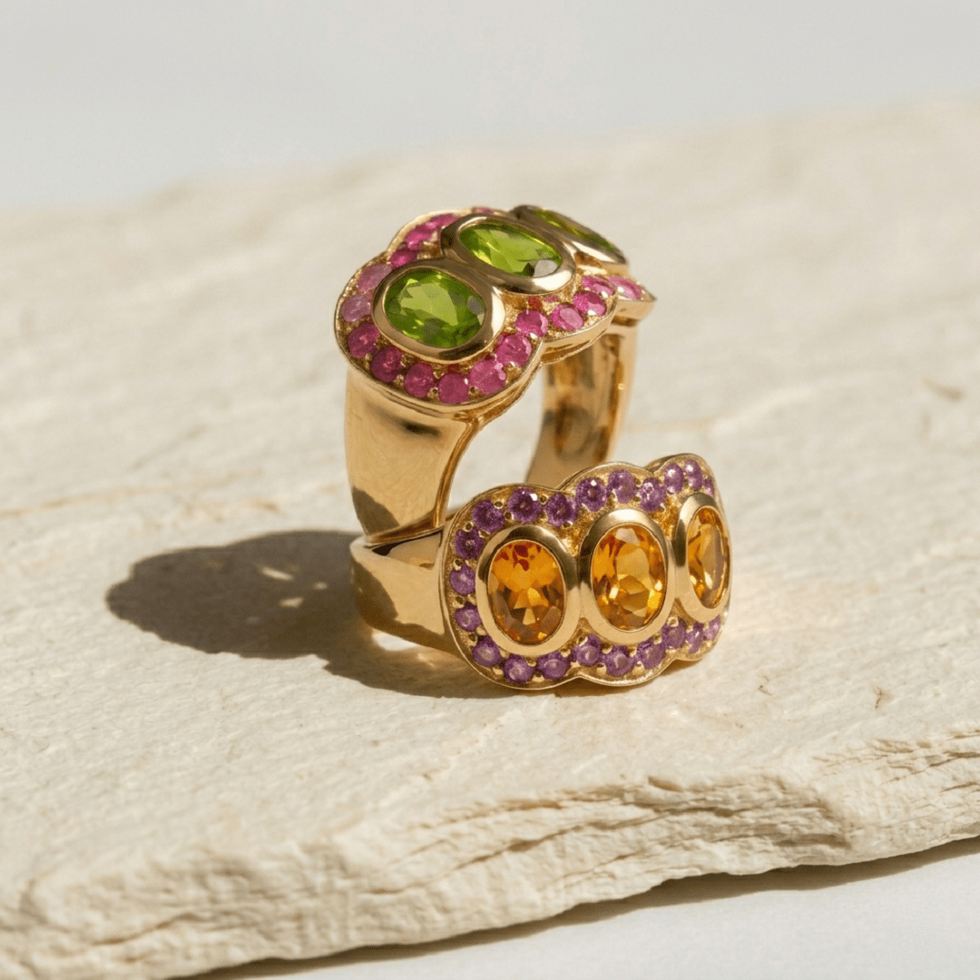 Chaque pierre, unique en son éclat, offre une touche de couleur et de sophistication, faisant de cette bague un bijou d’exception. Les teintes peuvent légèrement varier, garantissant une pièce singulière et personnelle.
