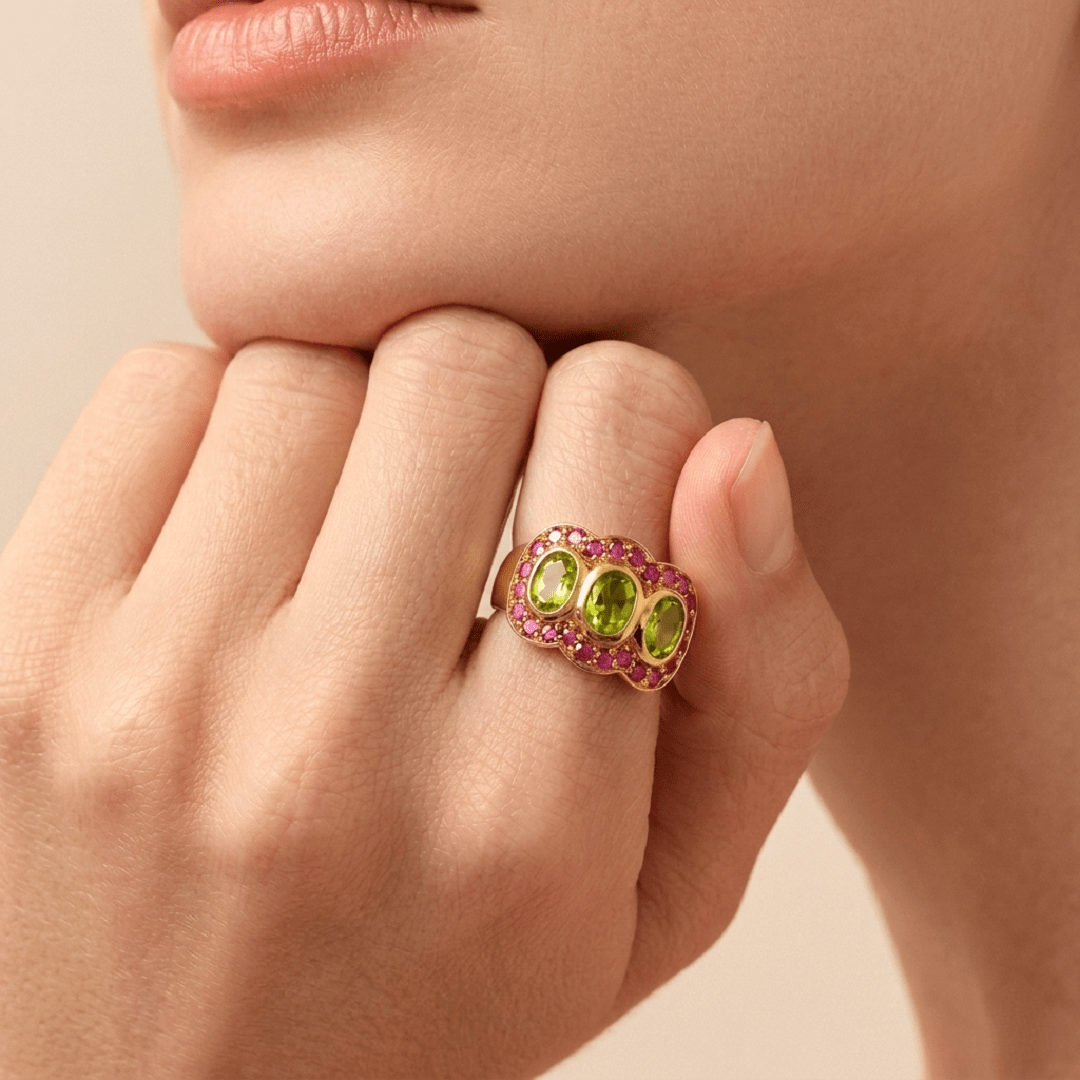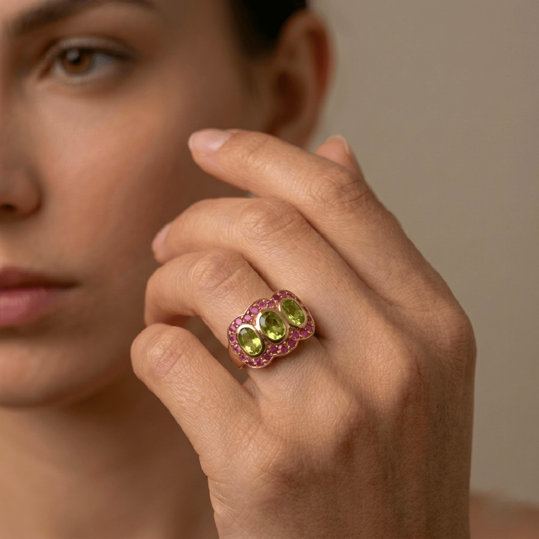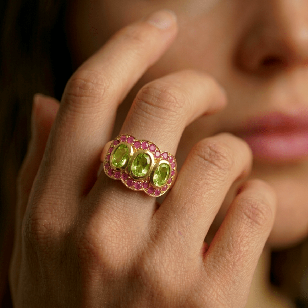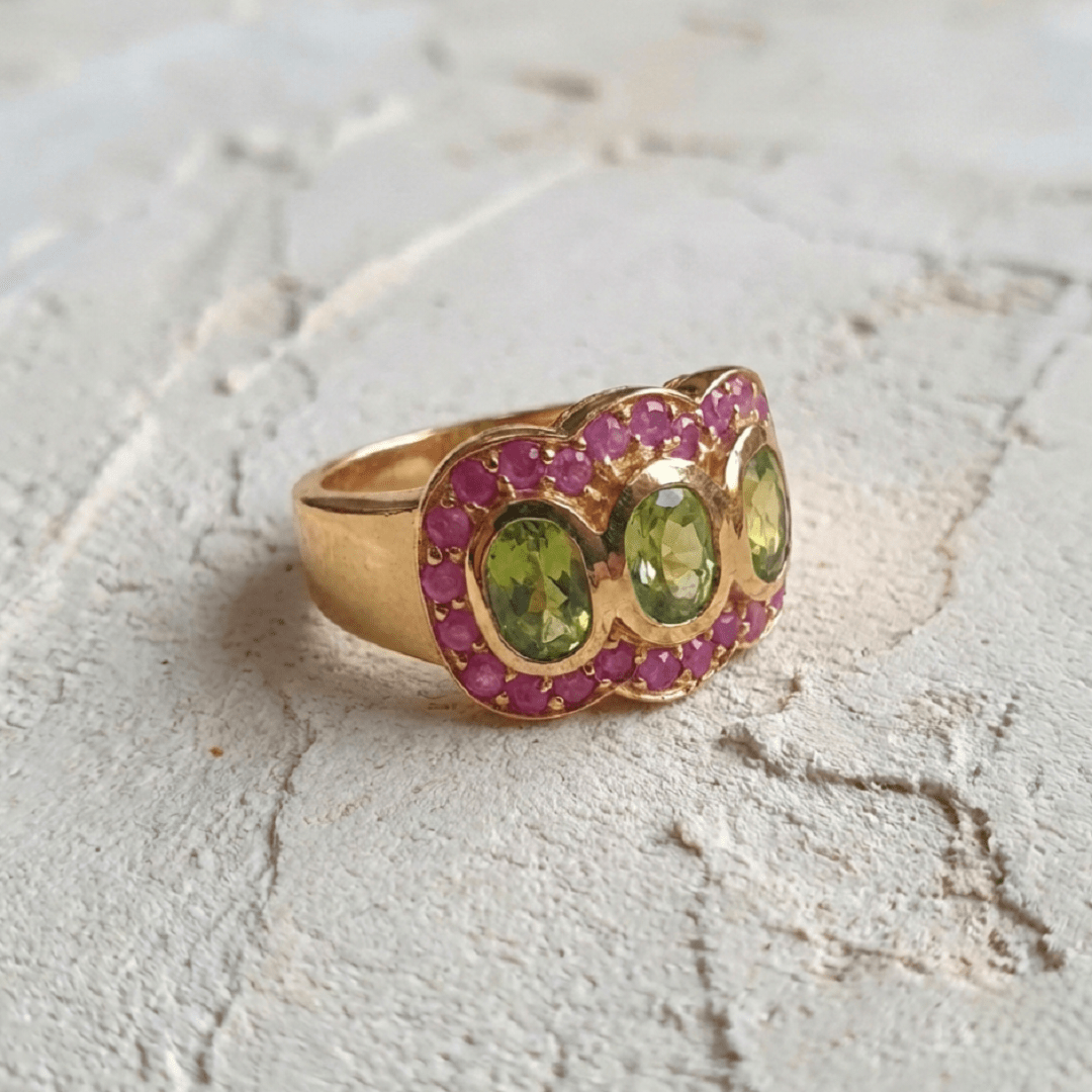 Élégante et intemporelle, la bague Trilogie en argent 925 recouverte d’or 22 carats incarne le raffinement. Trois péridots verts éclatants, délicatement mis en valeur par un pavé de rubis roses créent un jeu de lumière subtil et harmonieux.