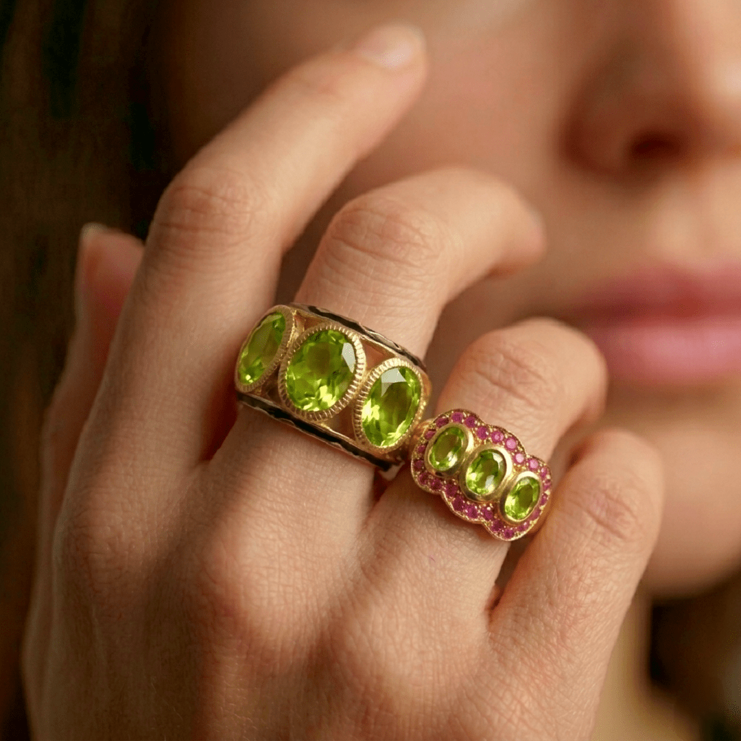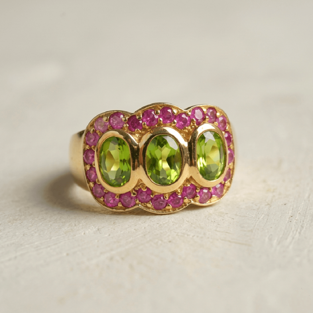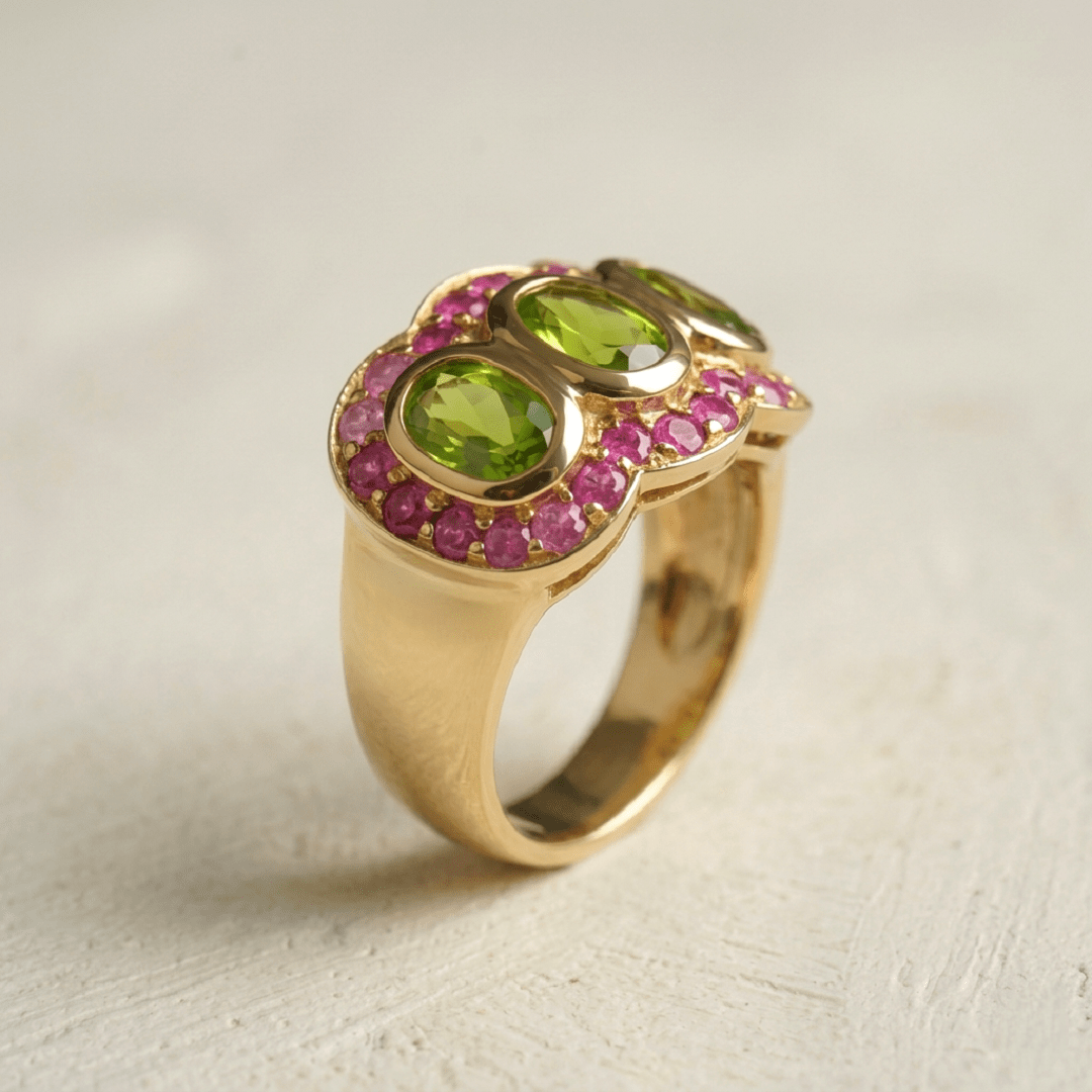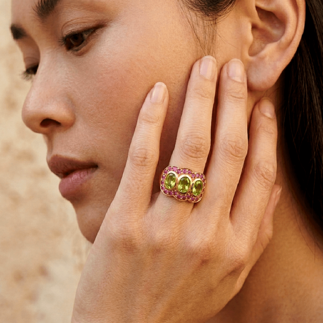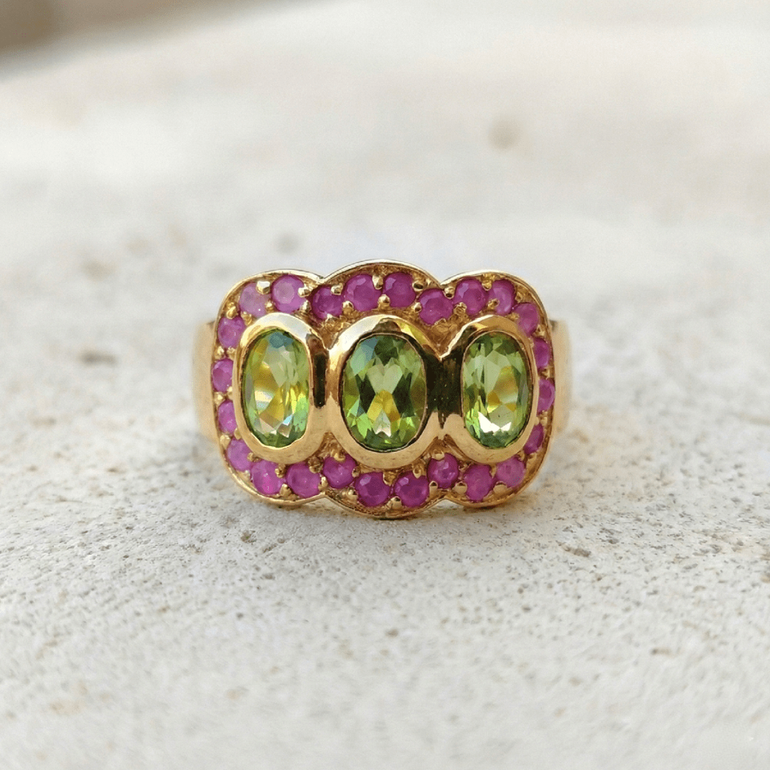 Élégante et intemporelle, la bague Trilogie en argent 925 recouverte d’or 22 carats incarne le raffinement. Trois péridots verts éclatants, délicatement mis en valeur par un pavé de rubis roses créent un jeu de lumière subtil et harmonieux.