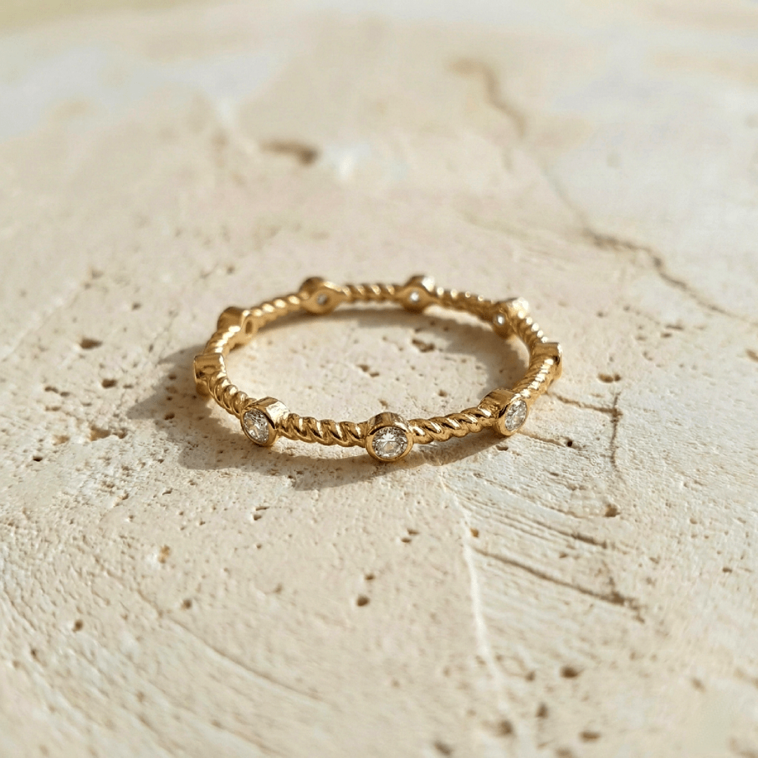 Éclatante et intemporelle, la bague Victoria met en lumière la beauté des topazes naturelles, serties sur un anneau en argent 925 plaqué or 22 carats. Son design épuré et raffiné en fait une pièce parfaite à porter seule pour un look délicat, ou à accumuler pour créer un style audacieux.