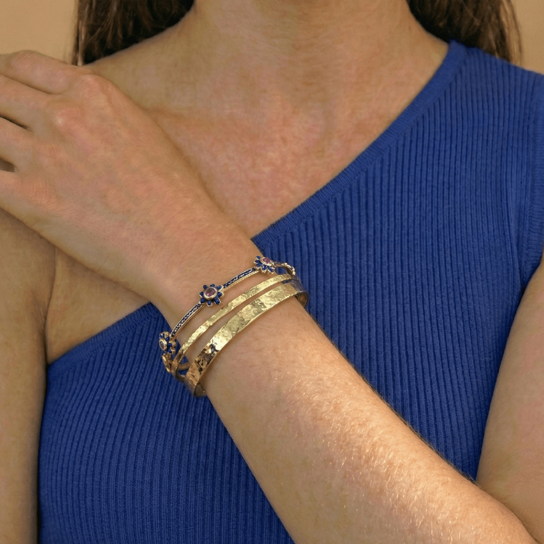 Élégance et raffinement s’unissent dans ce bangle d’exception. Conçu en argent 925 délicatement plaqué d’or 22 carats, il se pare de fines fleurs en émail bleu, chacune rehaussée d’un rubis éclatant.