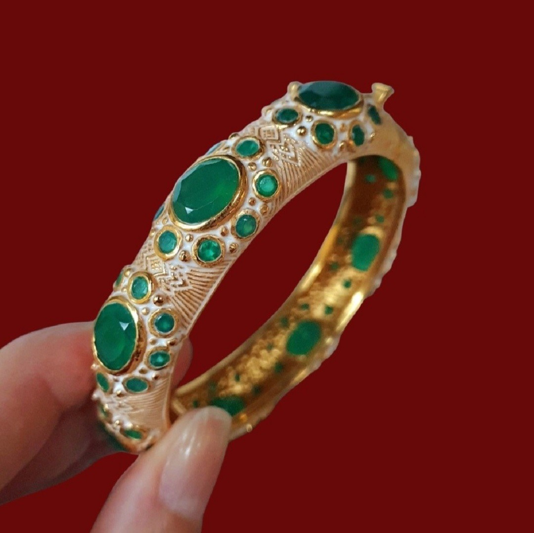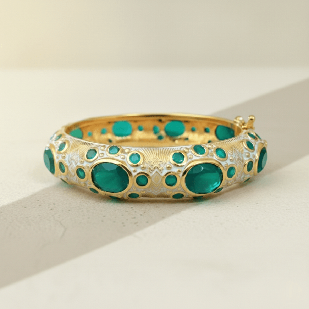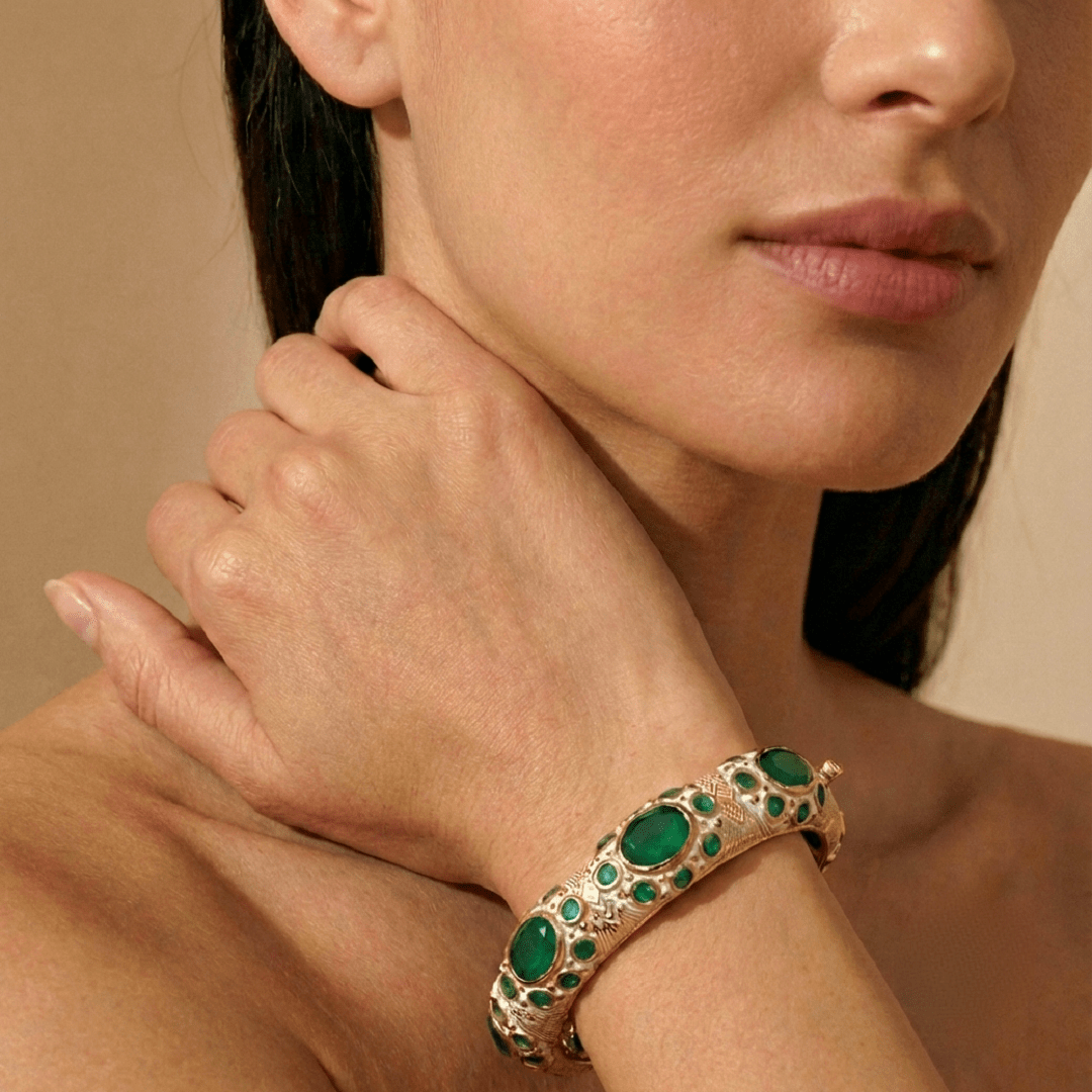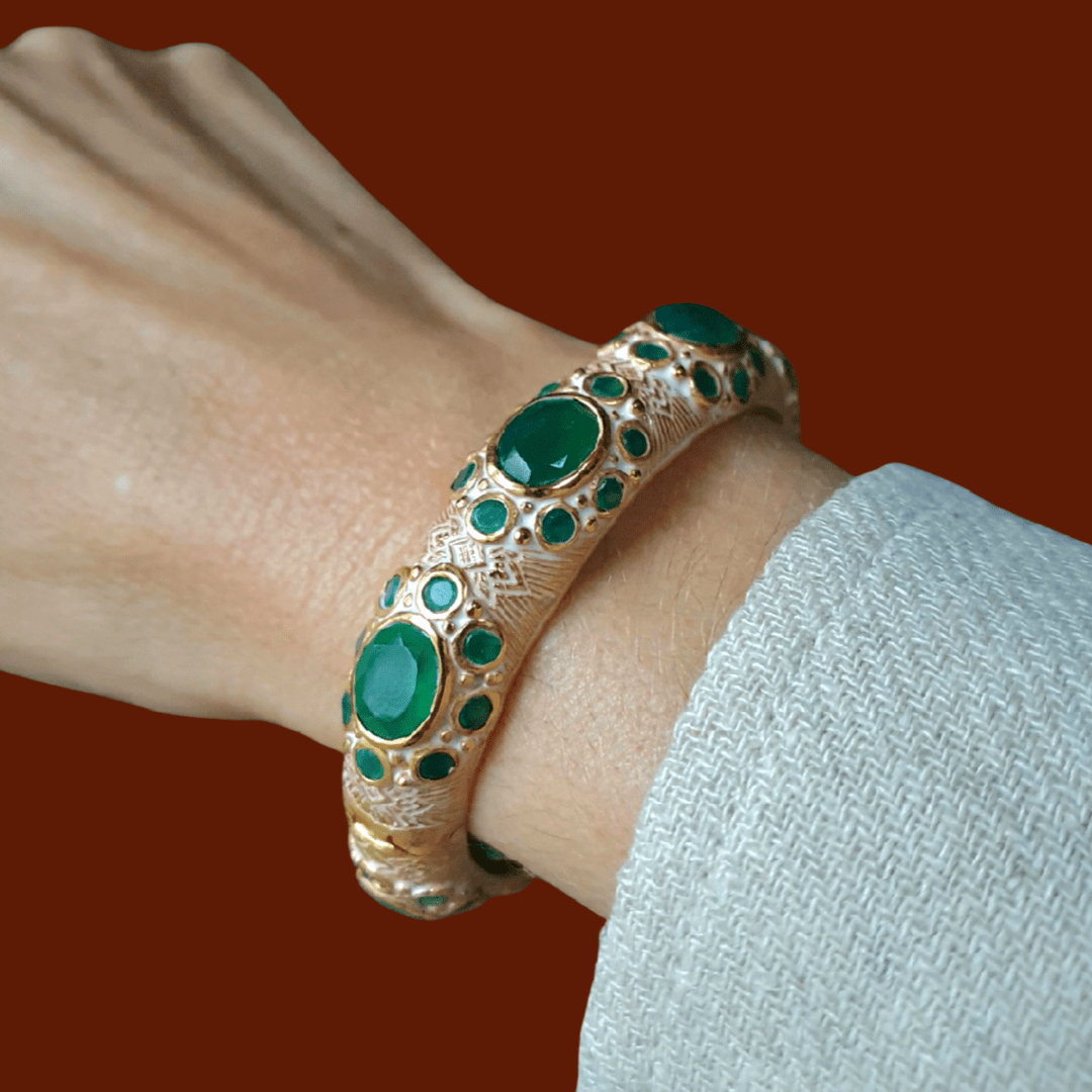Bangle Céleste en argent 925 plaqué or 22 carats, sublimé par un émail ivoire délicat et orné d’agates vertes. Ce bijou unique, fait main par nos artisans d’excellence, allie luxe et raffinement.