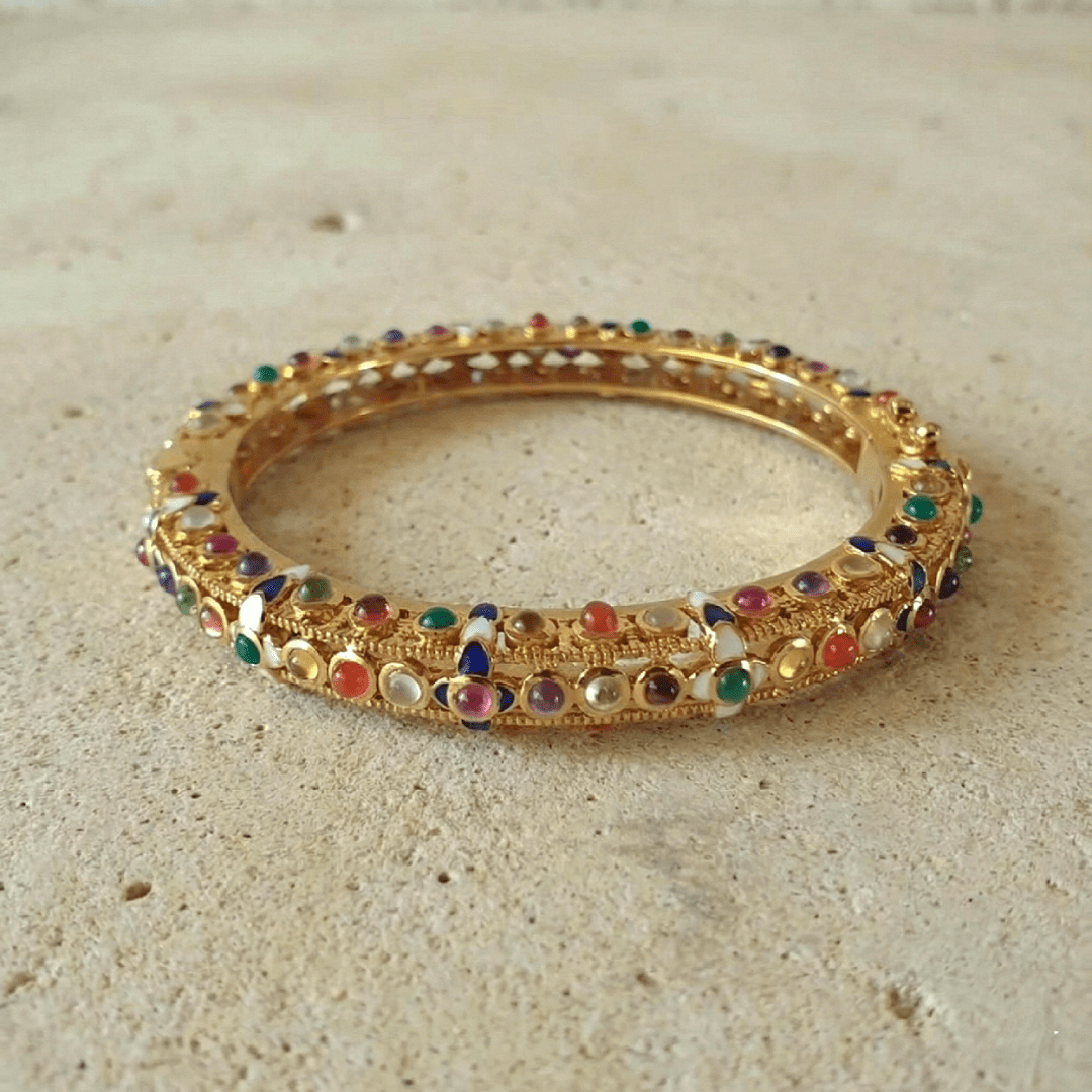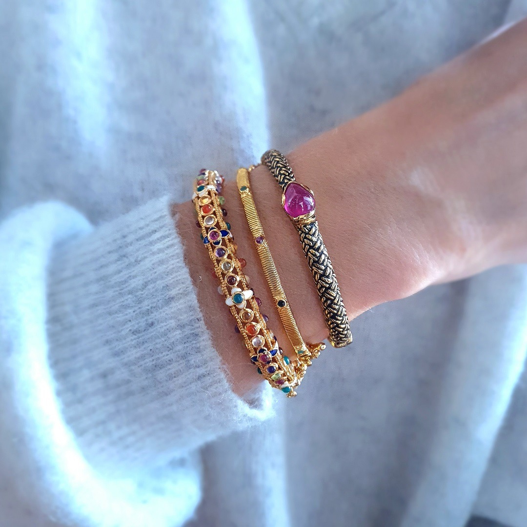 Sublimez votre poignet avec le bangle Diana, un bracelet d’exception en argent 925 recouvert d’or 22 carats, minutieusement orné de pierres fines et précieuses. Chaque détail est façonné à la main, révélant un travail d’orfèvrerie unique et raffiné. Ses délicates fleurs émaillées blanches et bleues ajoutent une touche de poésie et d’élégance intemporelle.