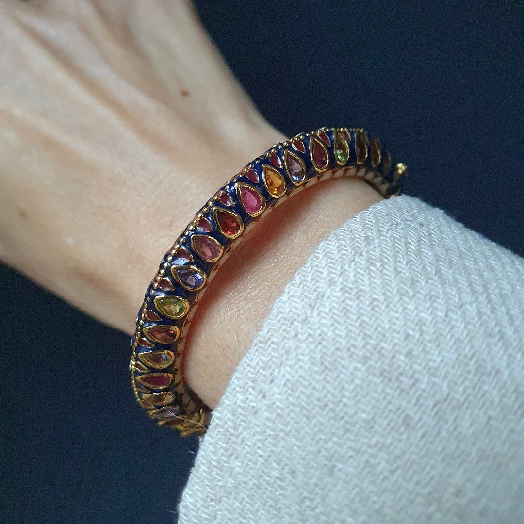 Sublimez votre poignet avec le bangle Kate, un bracelet raffiné en argent 925 plaqué or 22 carats, orné d’un somptueux émaillage bleu et serti de pierres fines et précieuses. Symbole de sophistication et d’héritage artisanal, ce bangle est l’accessoire idéal pour sublimer votre élégance.