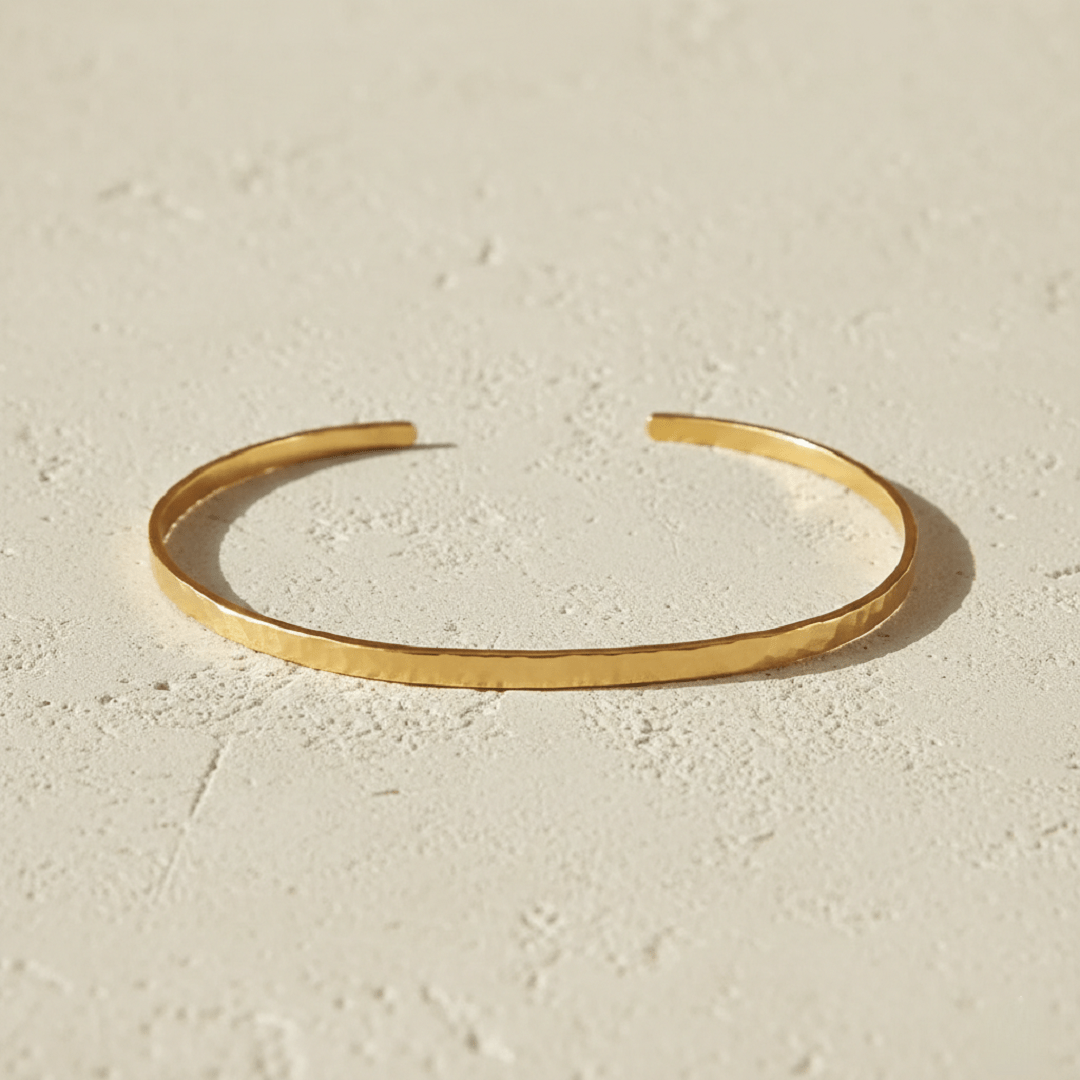 Apportez une touche de raffinement à votre poignet avec ce bangle martelé de 2,5 mm en argent 925 recouvert d’or 18 carats. Légèrement ajustable, il s’adapte parfaitement à toutes les morphologies et devient l’accessoire idéal pour compléter vos tenues avec subtilité.