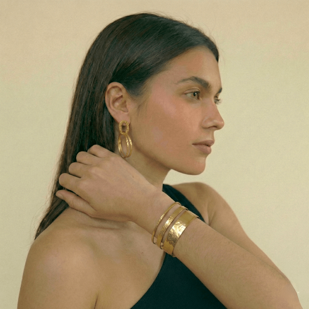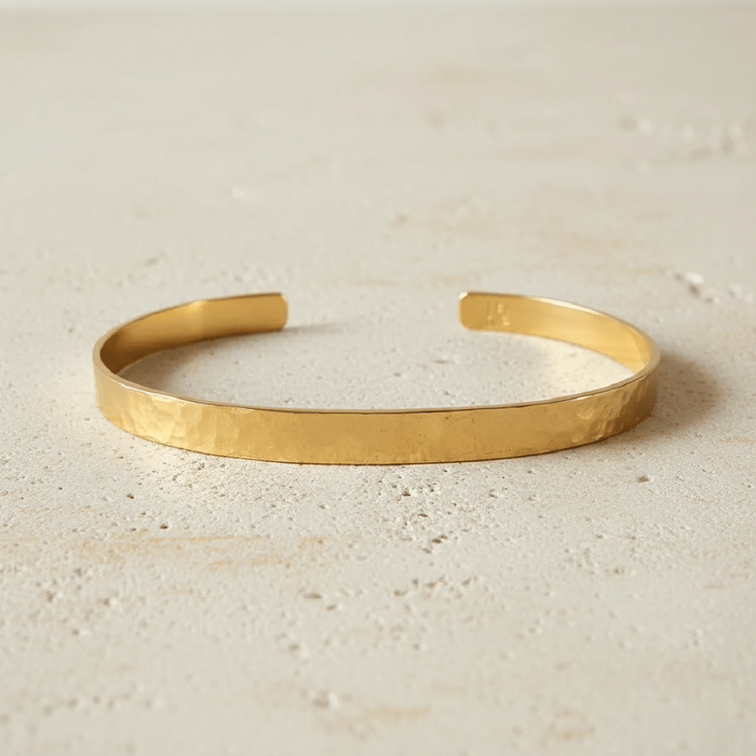 Chaque bangle est entièrement réalisé à la main, ce qui en fait une pièce unique, alliant savoir-faire artisanal et design moderne. Sa finition martelée crée des jeux de lumière subtils, apportant à la fois texture et éclat au bijou, tout en restant discret et élégant.