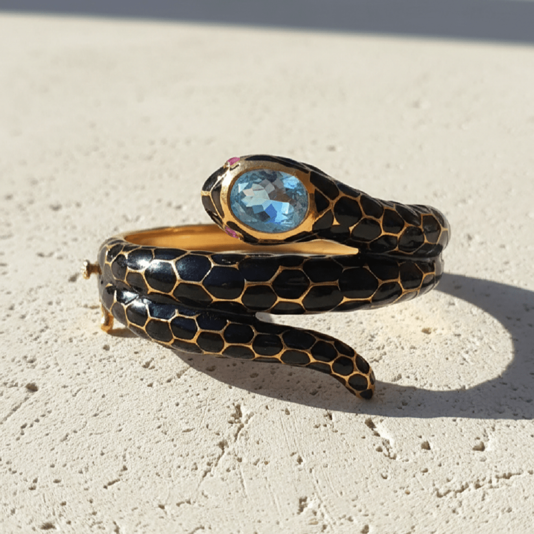 Bangle Serpent en argent 925 plaqué or 22 carats émaillé noir, sublimé par une tête ornée d’une topaze bleue facettée et des yeux en rubis. Ce bijou d’exception allie un savoir-faire artisanal à un design contemporain parfait pour sublimer vos tenues.
