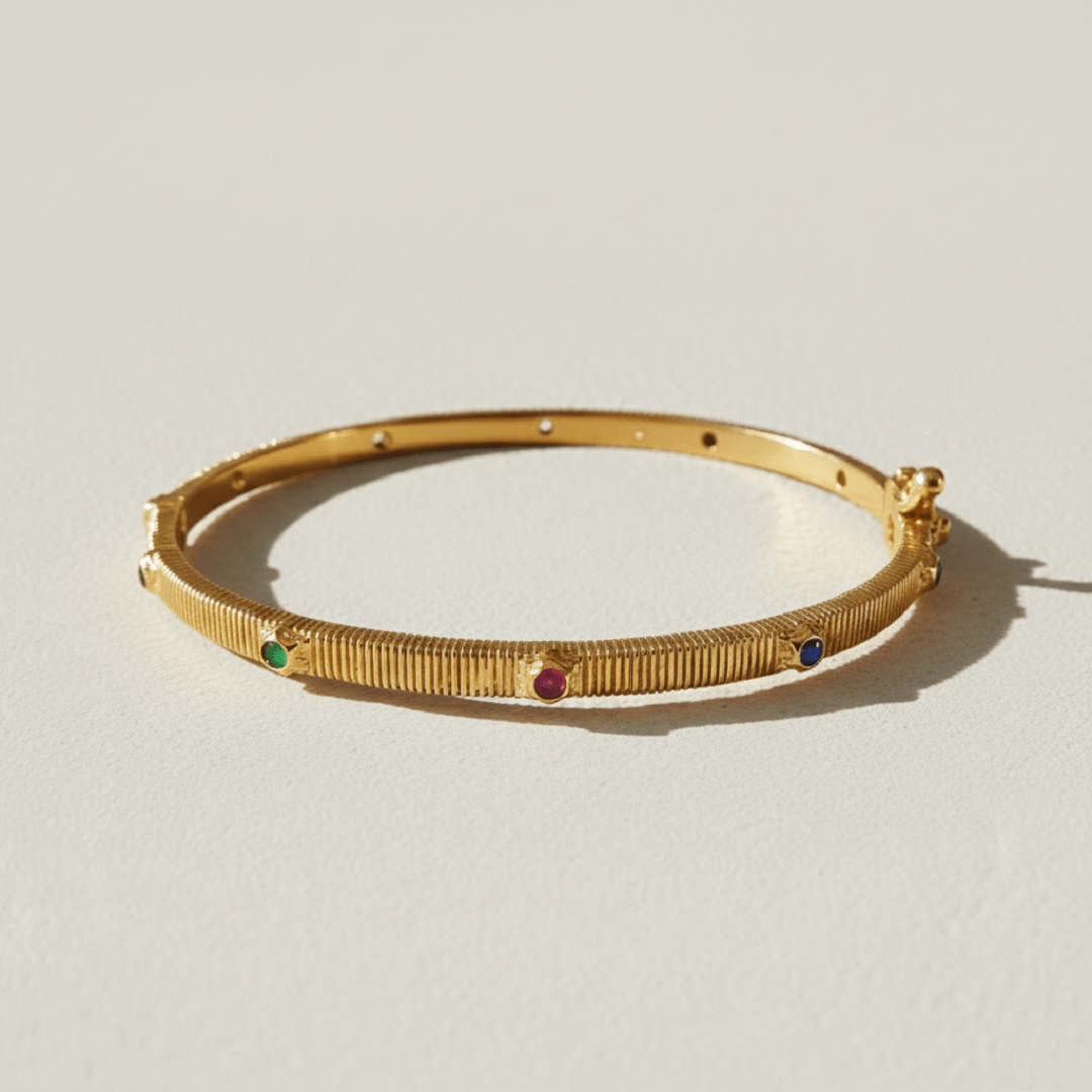 Chaque pierre, qu’elle soit émeraude, rubis ou saphir, est un chef-d’œuvre naturel dont la teinte peut légèrement varier, rendant chaque bangle unique en son genre.