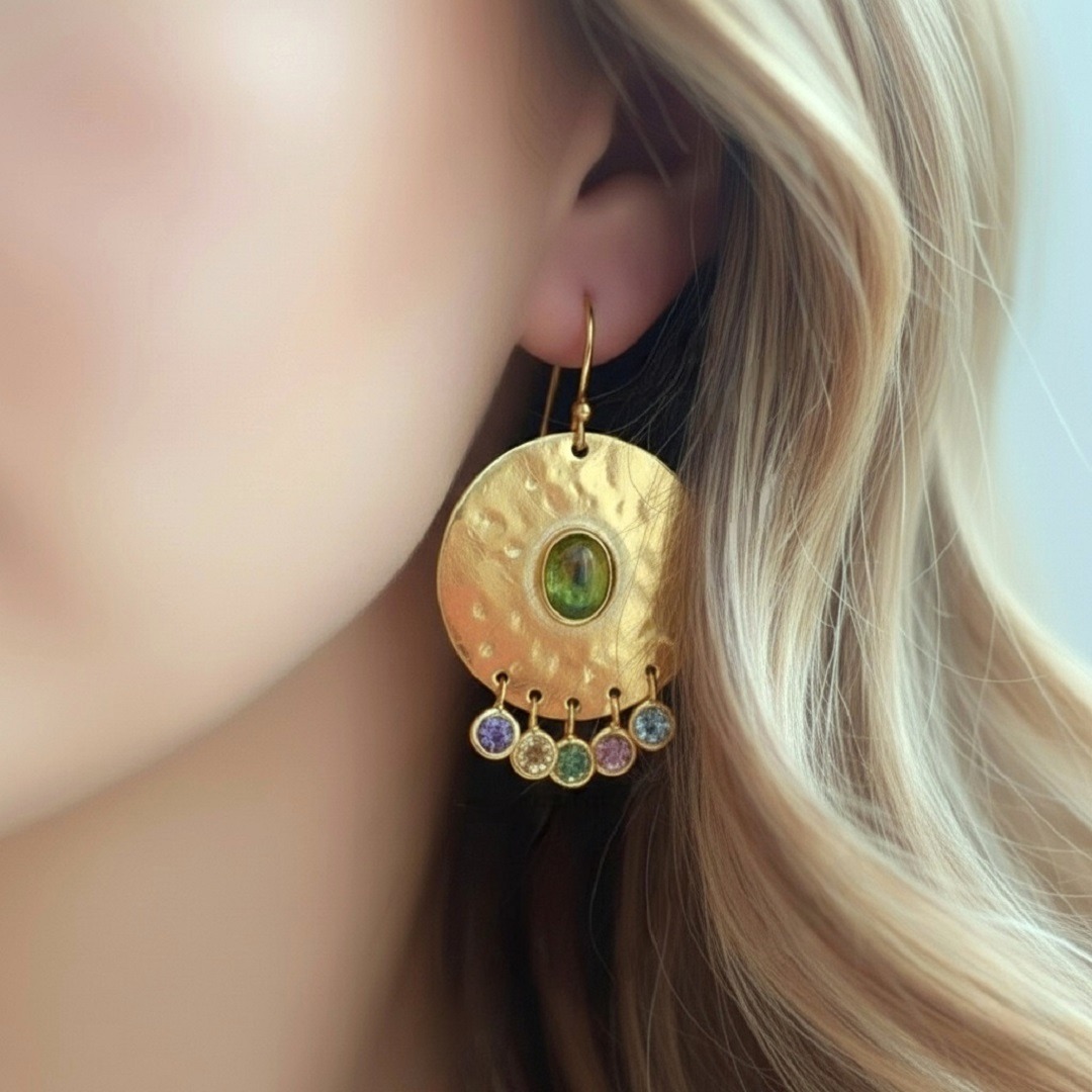 Éclatantes et solaires, les boucles d’oreilles Lou sont conçues en argent 925 plaqué or 18 carats. Chaque pièce est délicatement sertie d’un péridot central et sublimée par une harmonie de pierres fines multicolores en pampilles. Un bijou qui capte la lumière et sublime chaque mouvement avec raffinement.