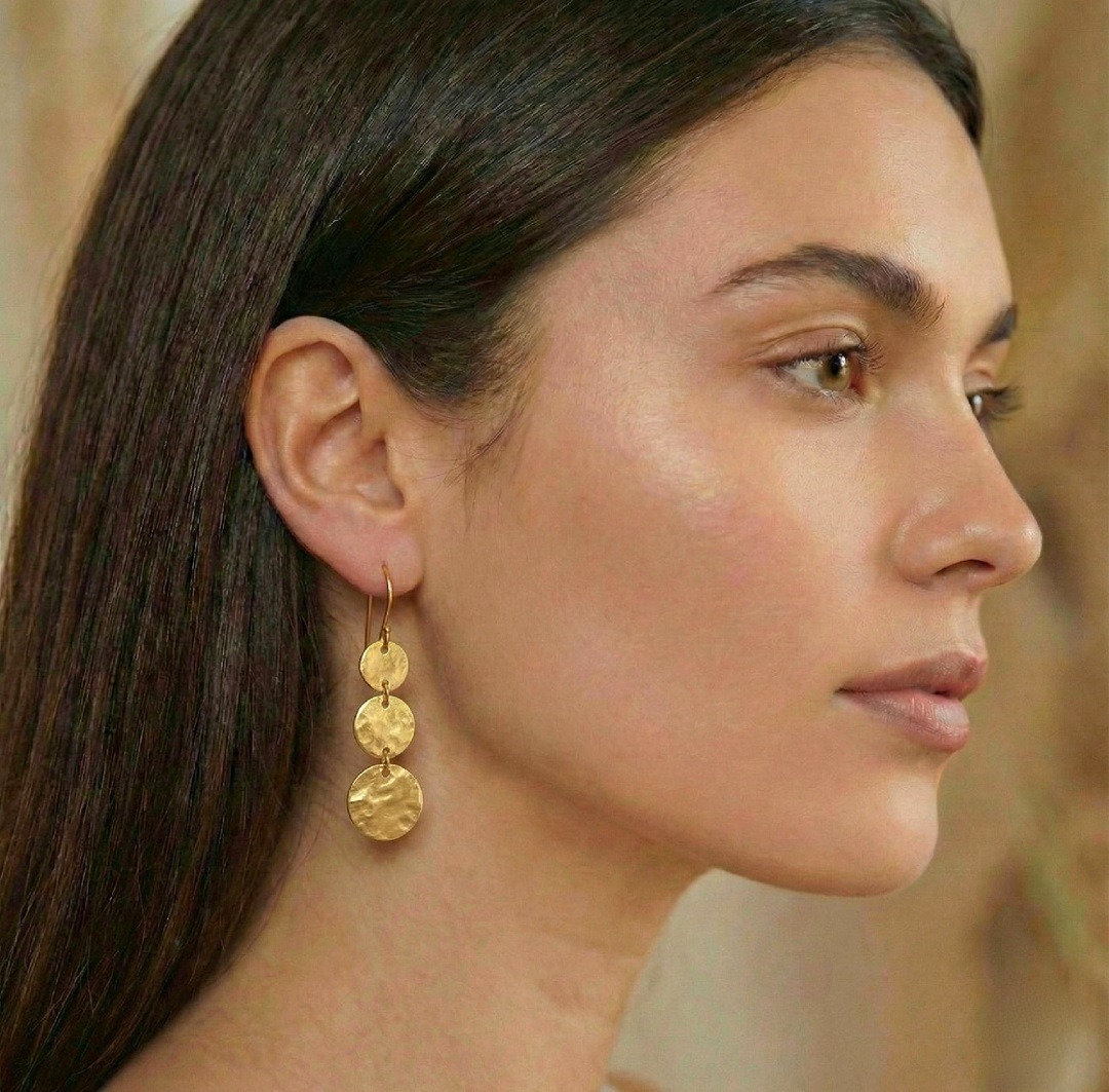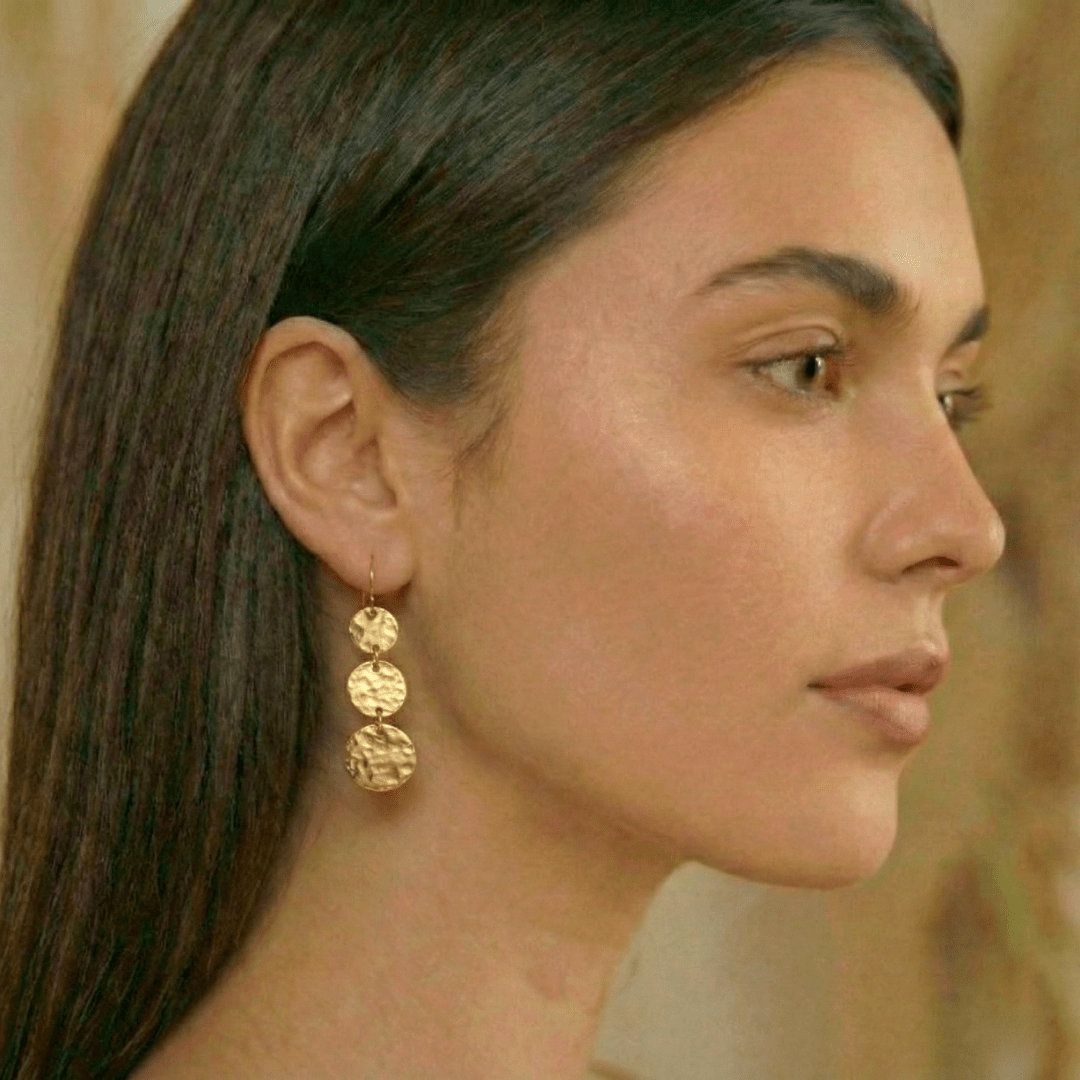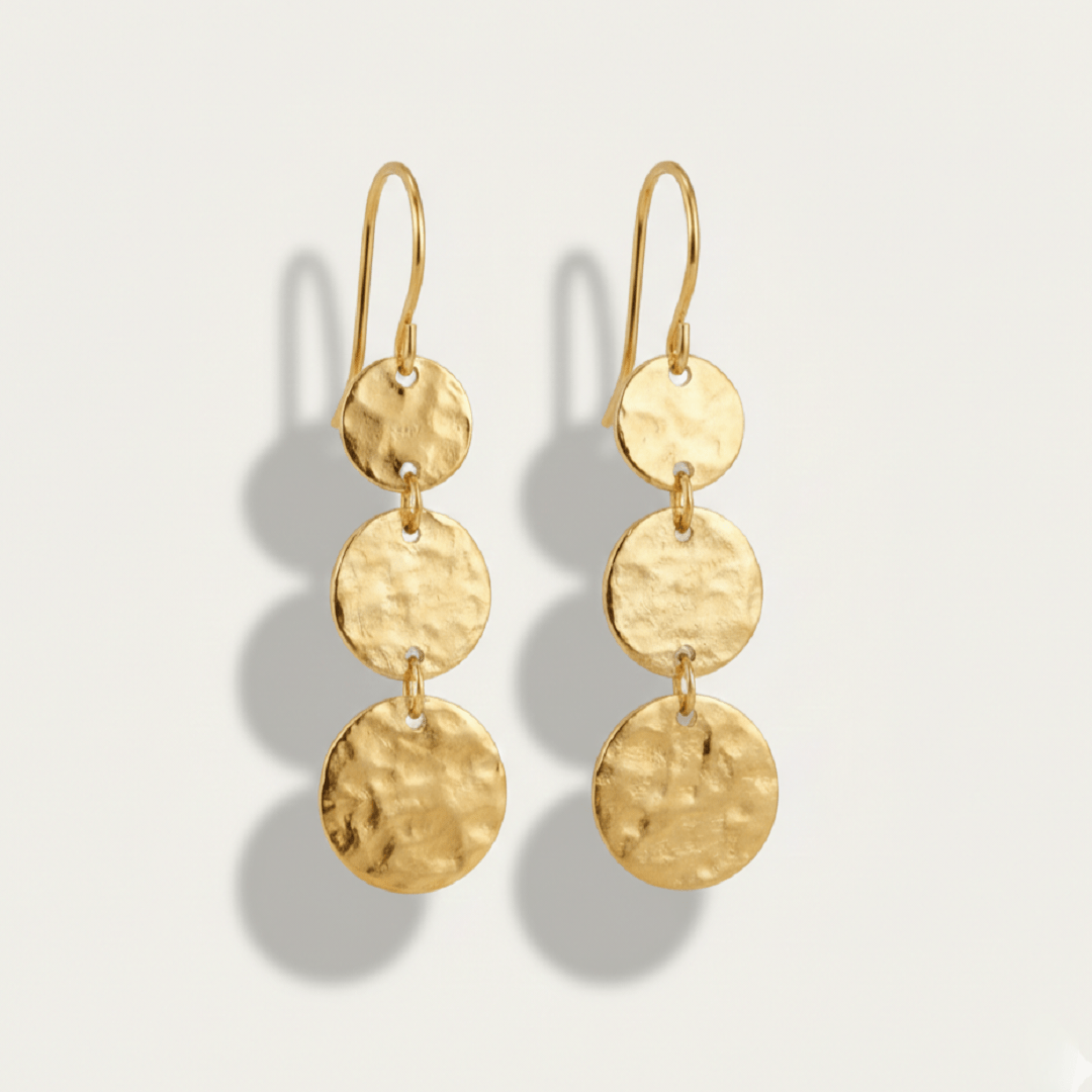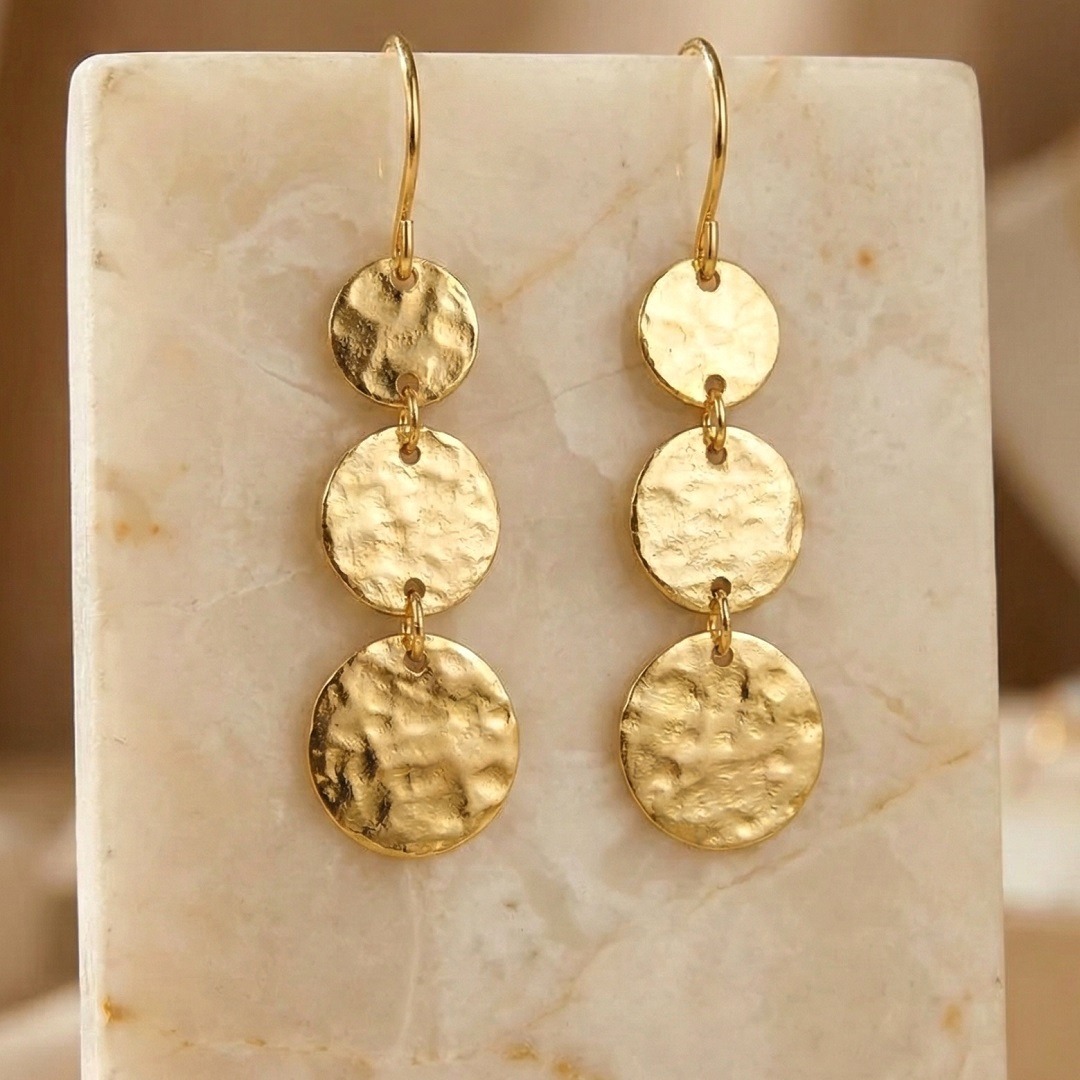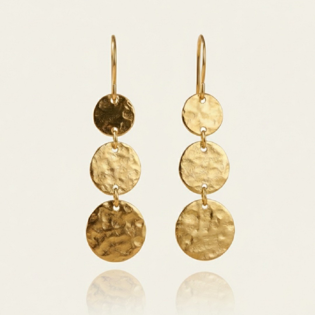 Boucles d’oreilles en argent 925 recouvertes d’or 18 carats ornées de trois médailles martelées. Leur design léger et contemporain les rend parfaites pour toutes les occasions, ajoutant une touche de sophistication et d’élégance à votre style.