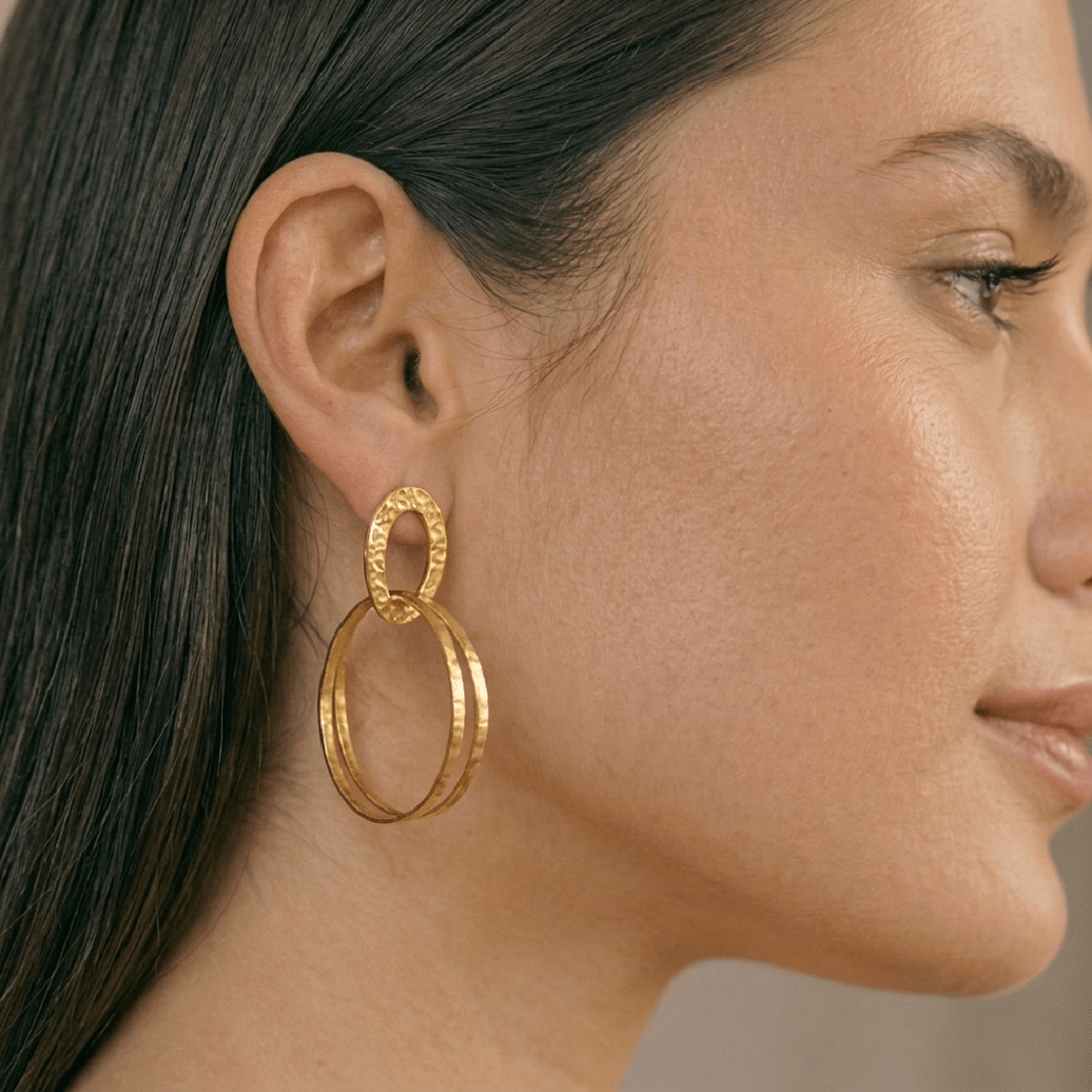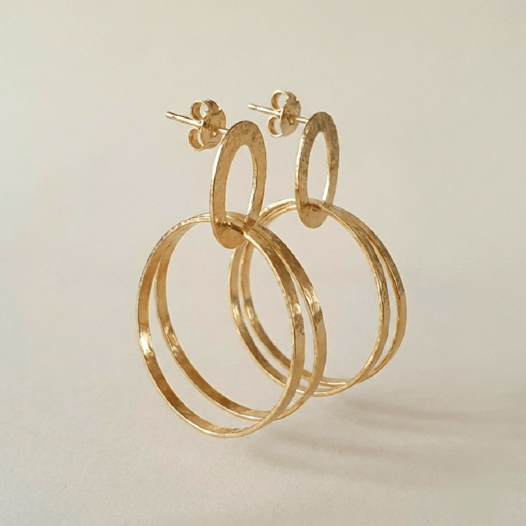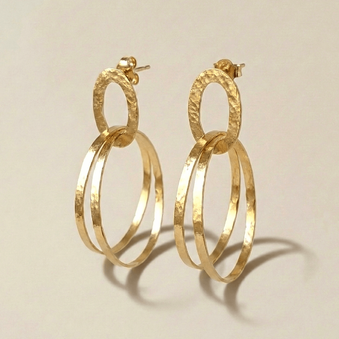 Apportez une touche d’authenticité et de raffinement à votre collection avec ces sublimes boucles d’oreilles façonnées à la main. Réalisées en argent 925 plaqué or 18 carats, elles séduisent par leur design d’anneaux entrelacés et leur texture délicatement martelée.