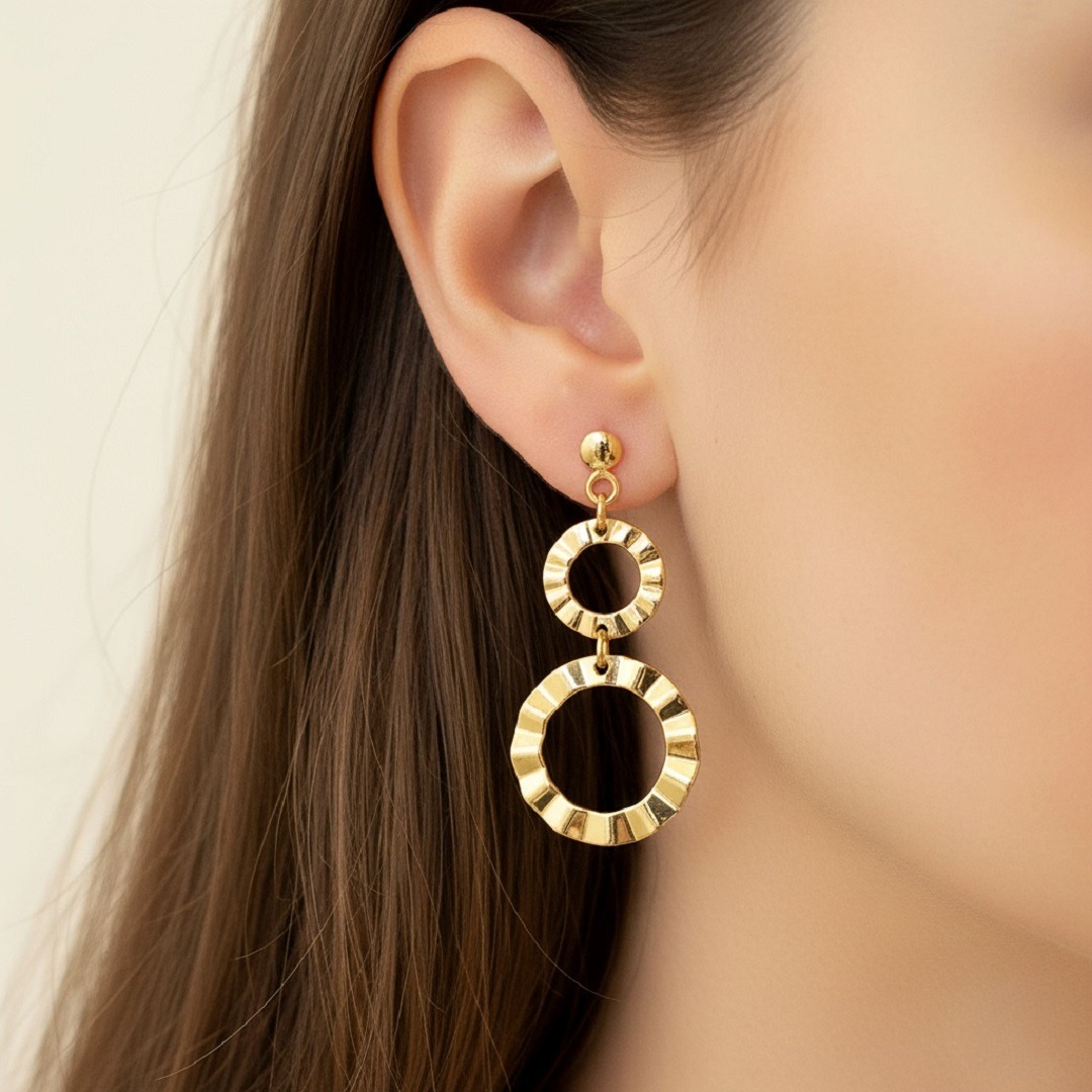 Ces boucles d’oreilles en argent 925 plaqué or 18 carats jouent avec les volumes et les textures dans une harmonie délicate. Composées de deux cercles finement martelés, elles captent la lumière avec subtilité et révèlent un style à la fois moderne, épuré et intemporel.