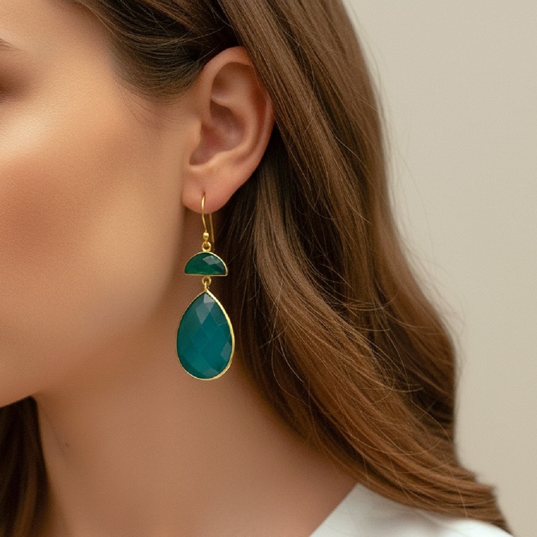 Élégantes et intemporelles, ces boucles d’oreilles en onyx vert naturel sont montées sur une base en argent 925 plaqué or 18 carats. Leur design associe une pierre demi-lune à une pierre goutte, pour une silhouette féminine et harmonieuse. Le vert profond de l’onyx apporte une touche de caractère, tandis que l’or ajoute une lumière douce et précieuse.