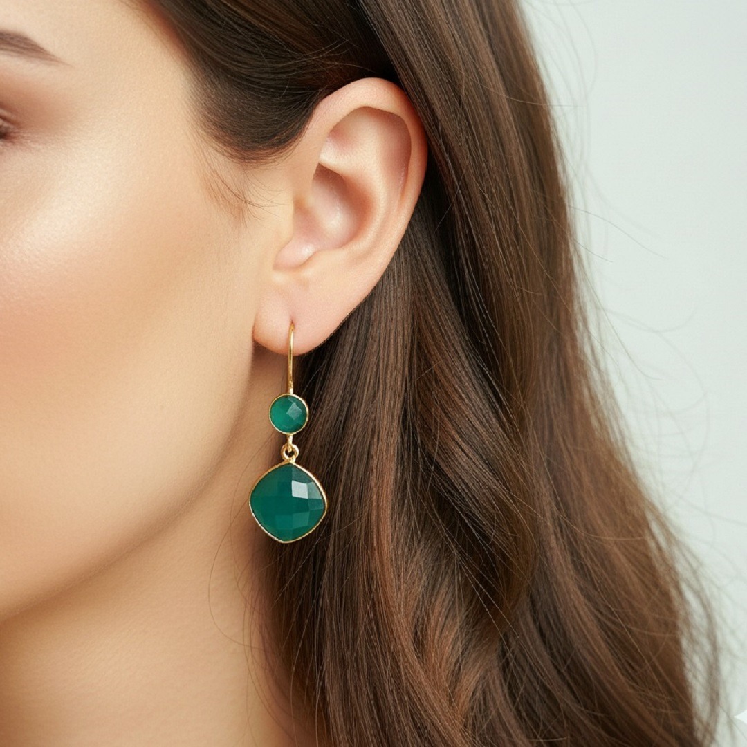 Boucles d’oreilles onyx vert aux lignes raffinées, ces pendantes délicates associent deux pierres naturelles facettées, montées en cascade pour créer une silhouette féminine et harmonieuse.