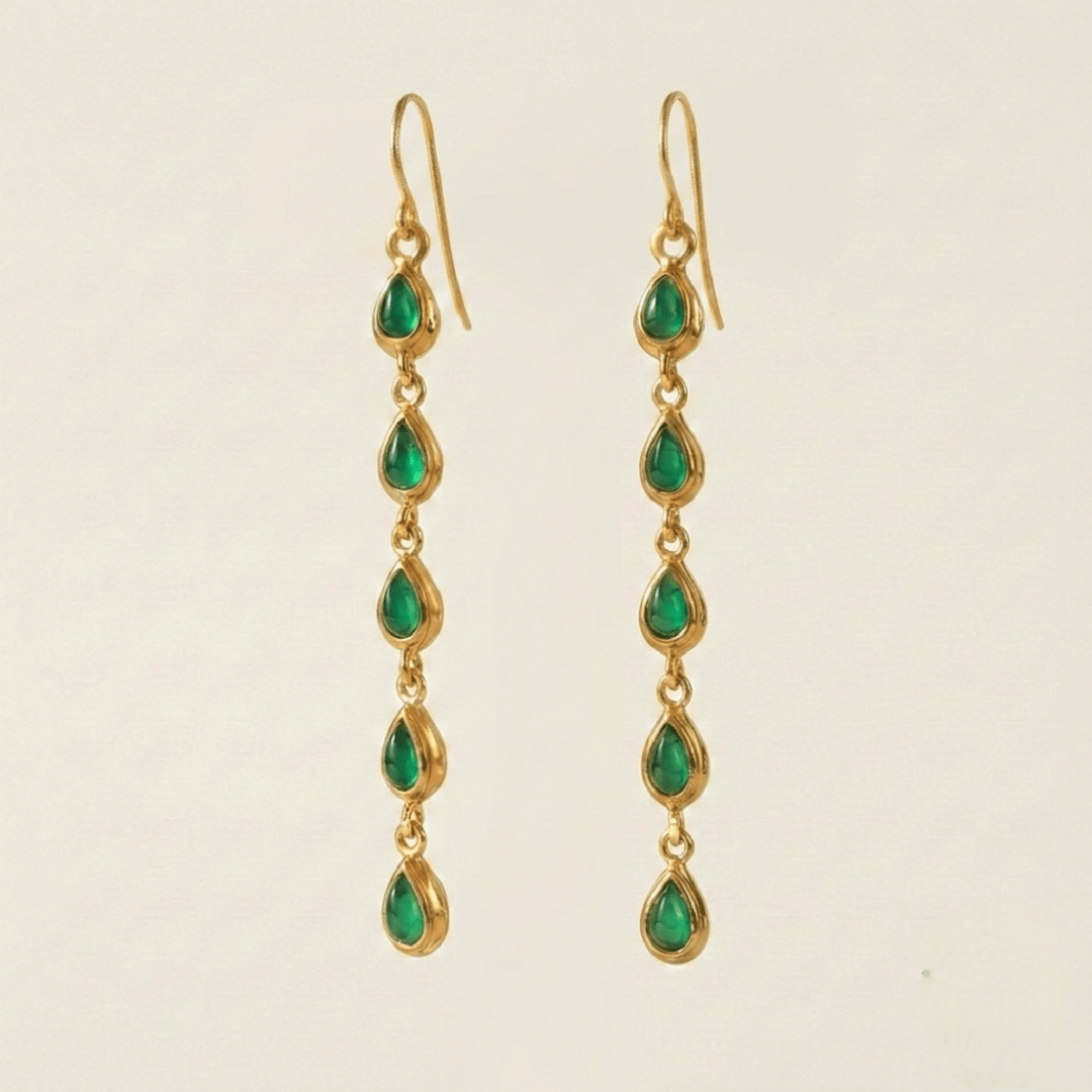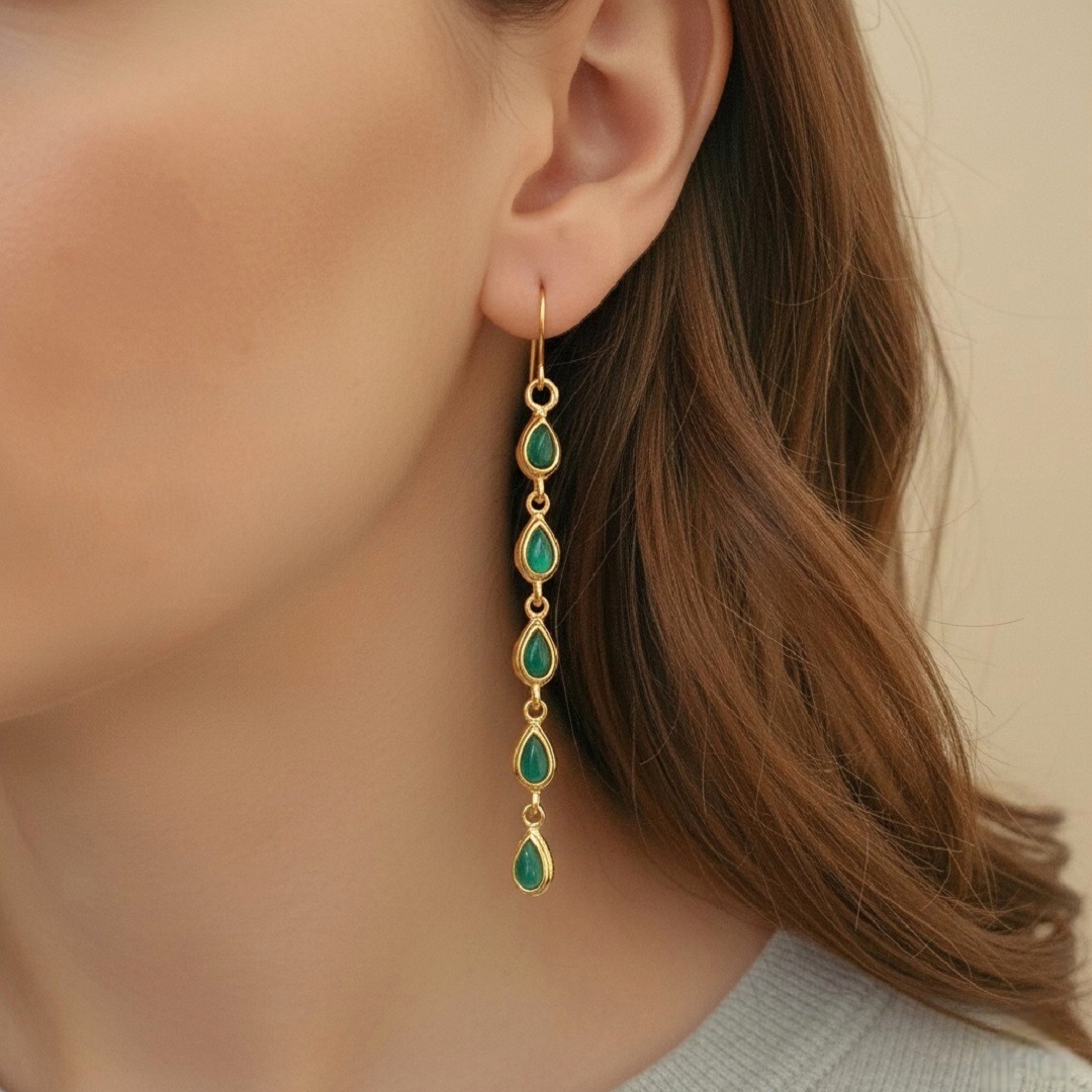 Boucles d’oreilles pendantes en argent 925 recouvertes d’or 22 carats ornées de pierres d’agate verte en forme de goutte. Leur design raffiné et épuré s’adapte parfaitement à toutes les occasions, offrant un équilibre entre sophistication et style intemporel.