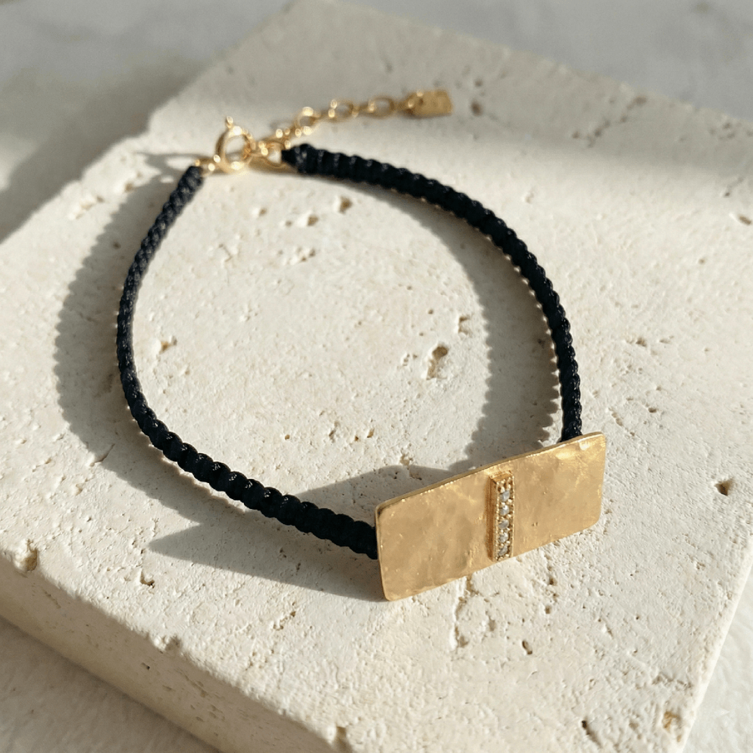 Bracelet Adèle sur cordon noir et médaille rectangle en argent plaqué or 18 carats sertie de topazes blanches.