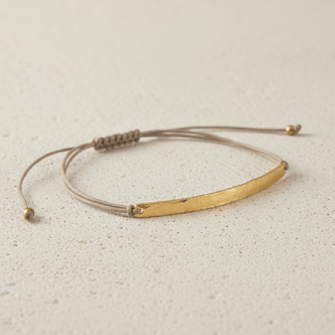 Bracelet barrette en argent plaqué or 18 carats ajustable grâce à un cordon kaki coulissant.