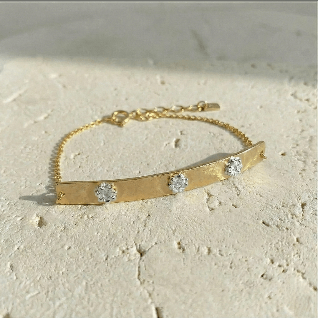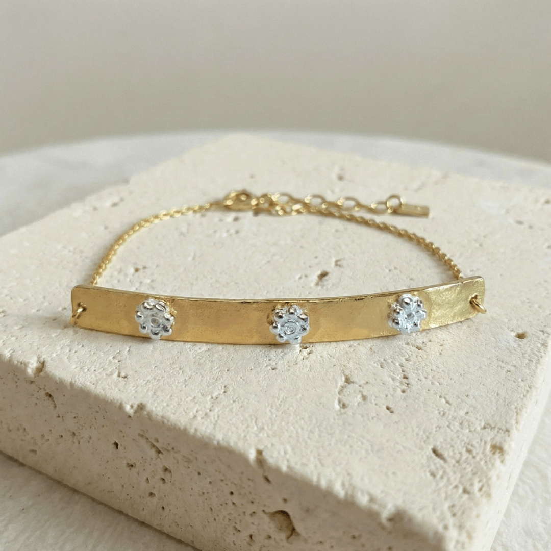 Bracelet barrette en argent plaqué or 18 carats serti de 3 fleurs en argent 925.