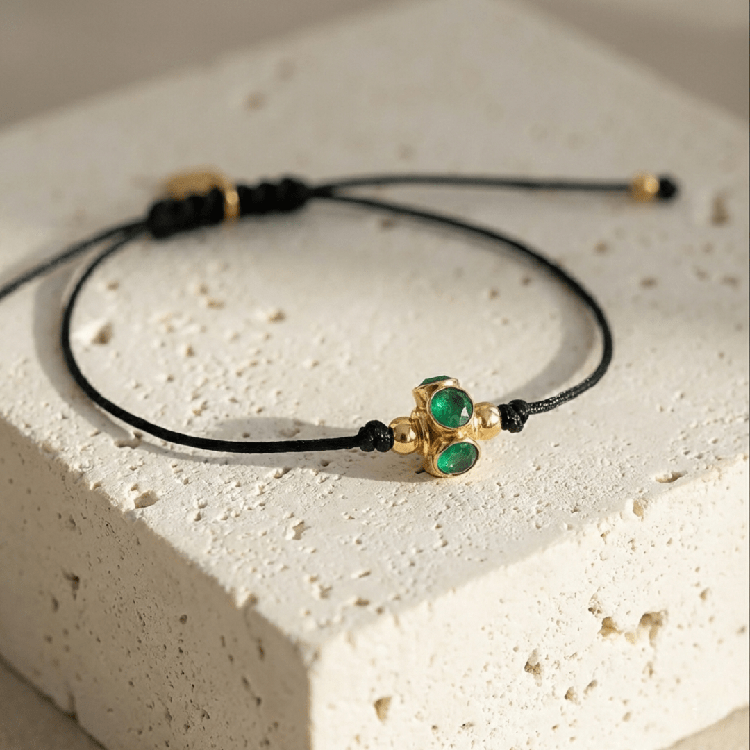 Bracelet charm en or 18 carats serti d’émeraudes ajustable grâce à un cordon noir coulissant.
