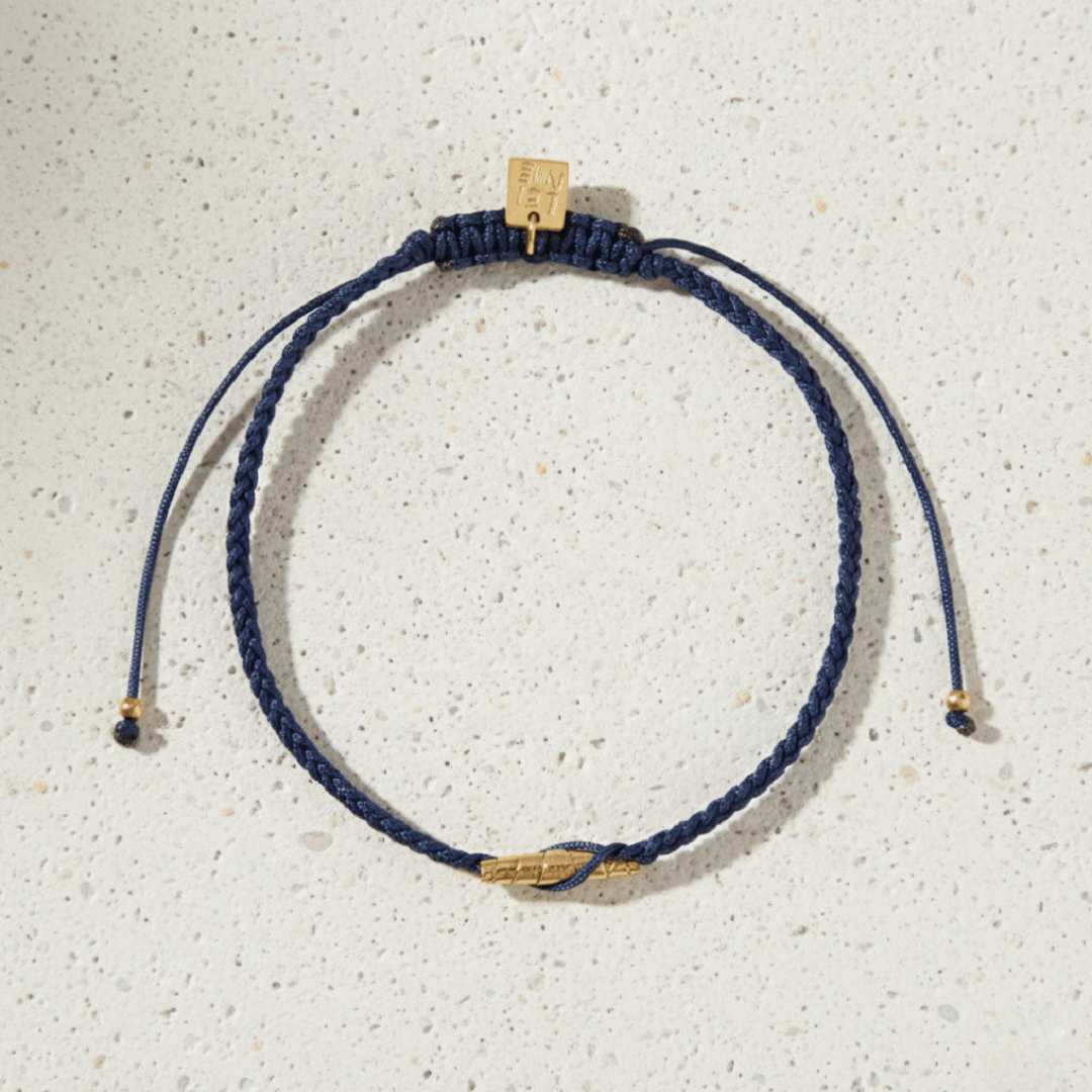 Bracelet pépite en argent plaqué or 18 carats ajustable grâce à un cordon marine coulissant.